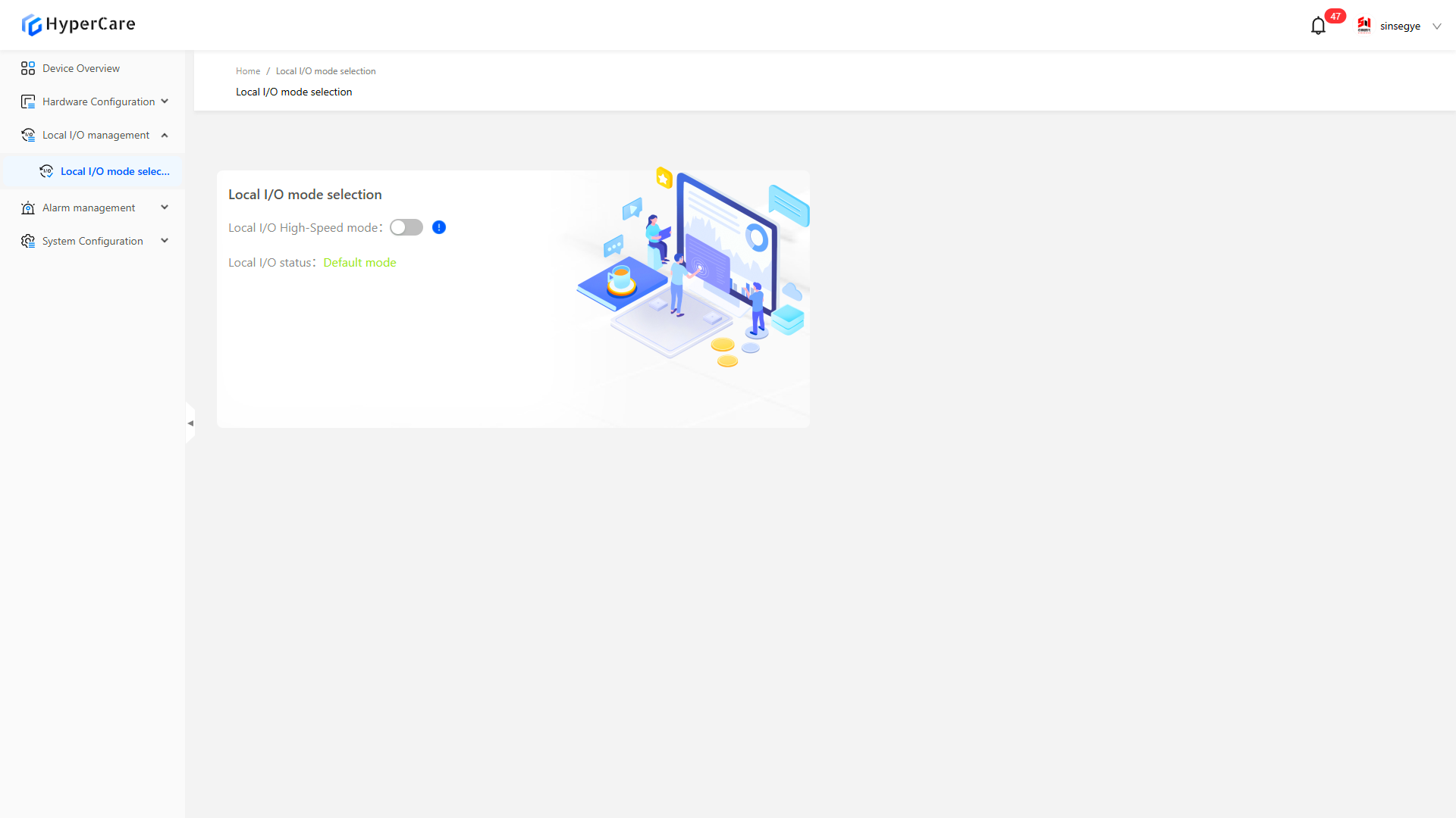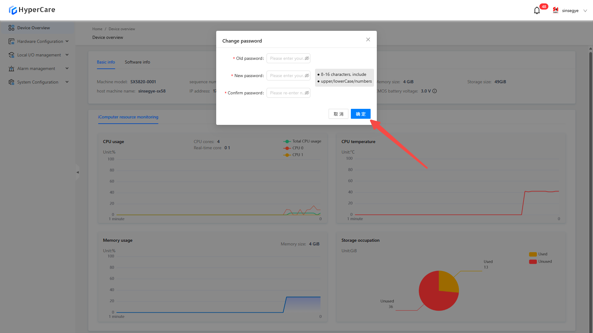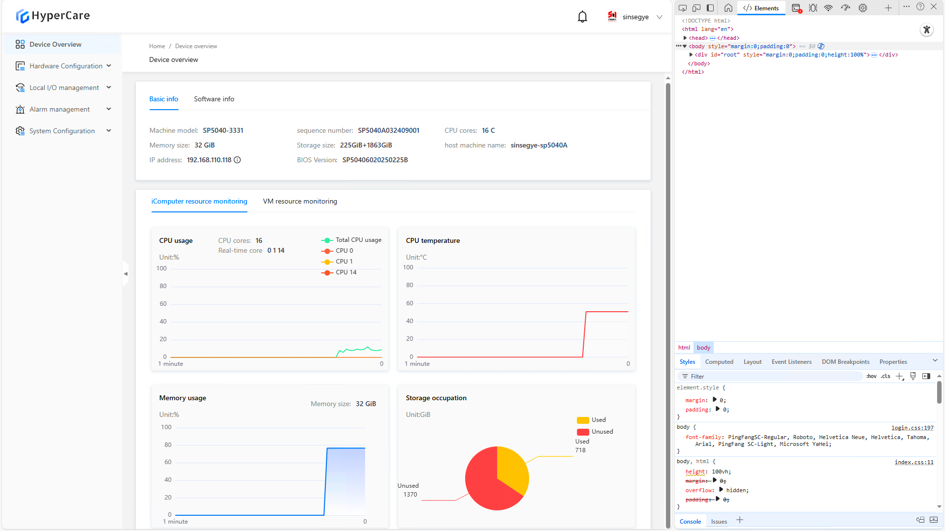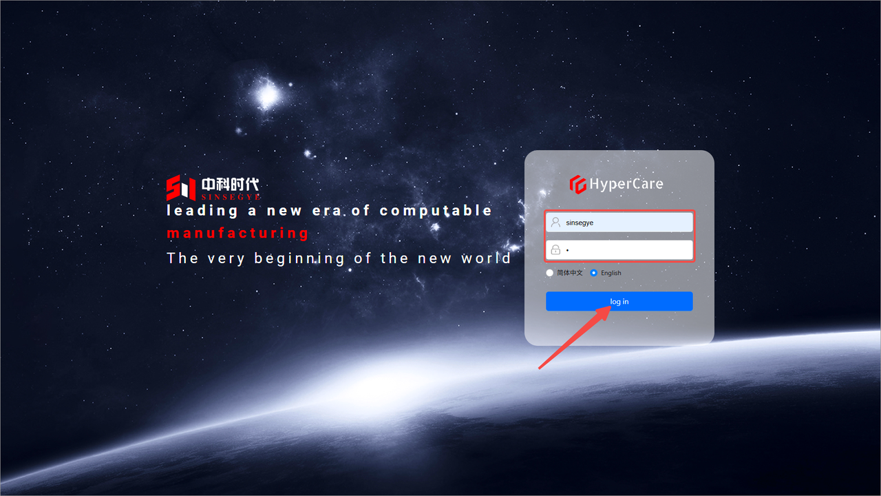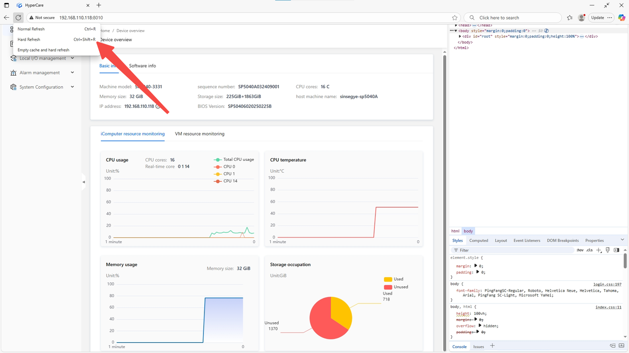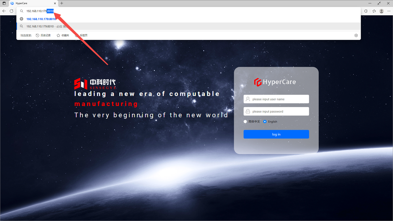 Open the browser, enter the IP address of the iComputer + \[:8010], and then press the \[Enter] key. The page jumps to the login interface of HyperCare.