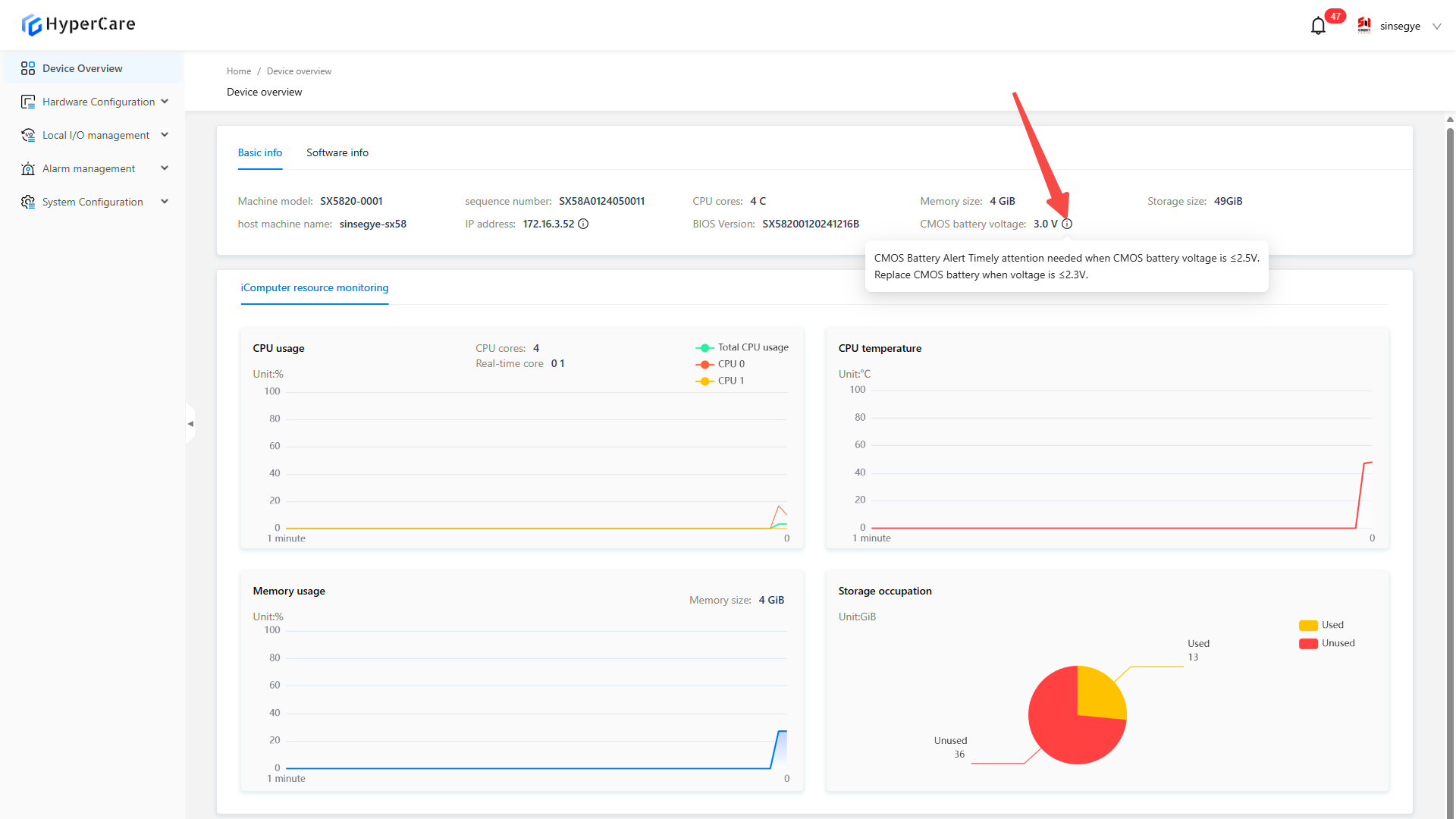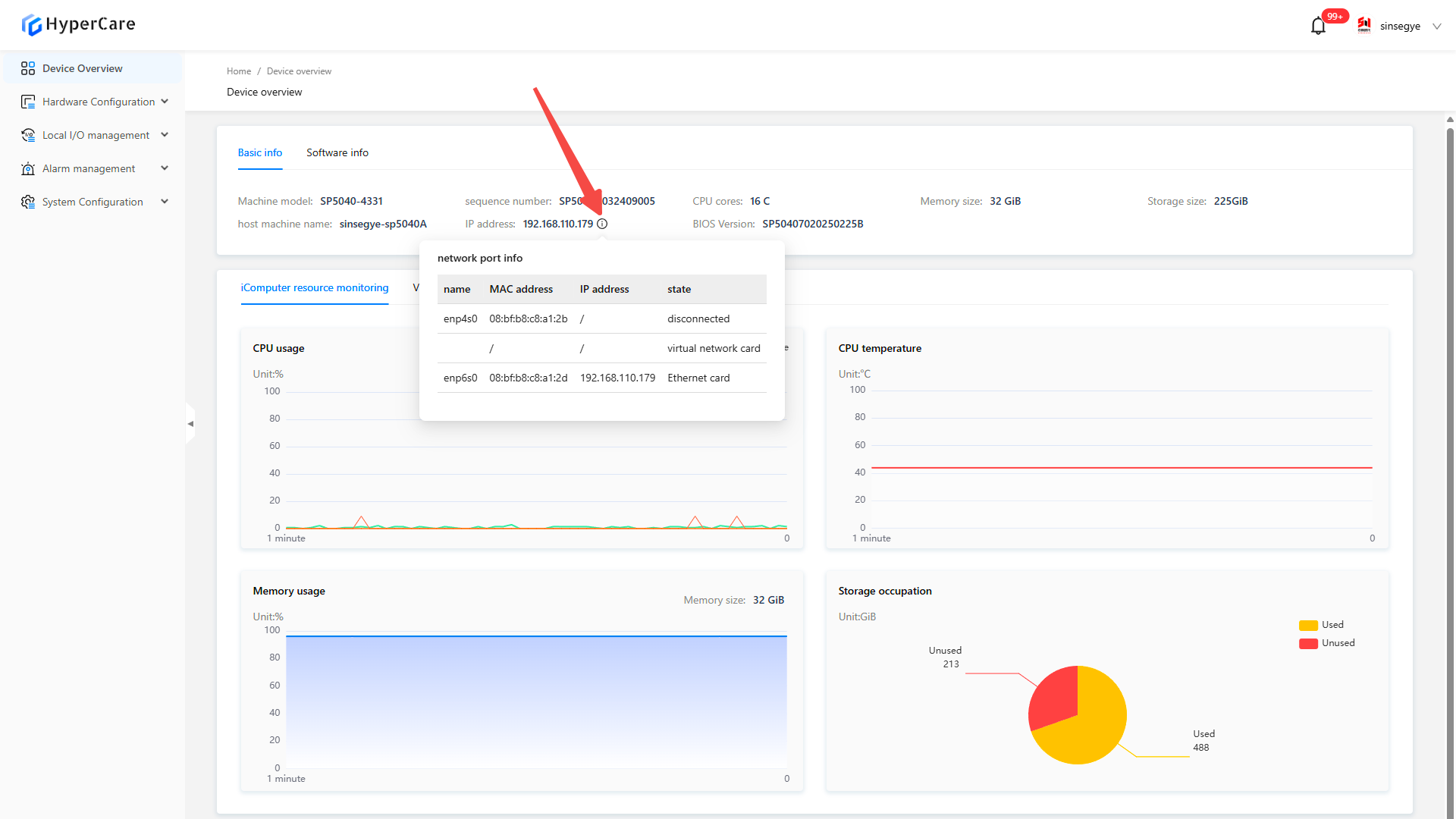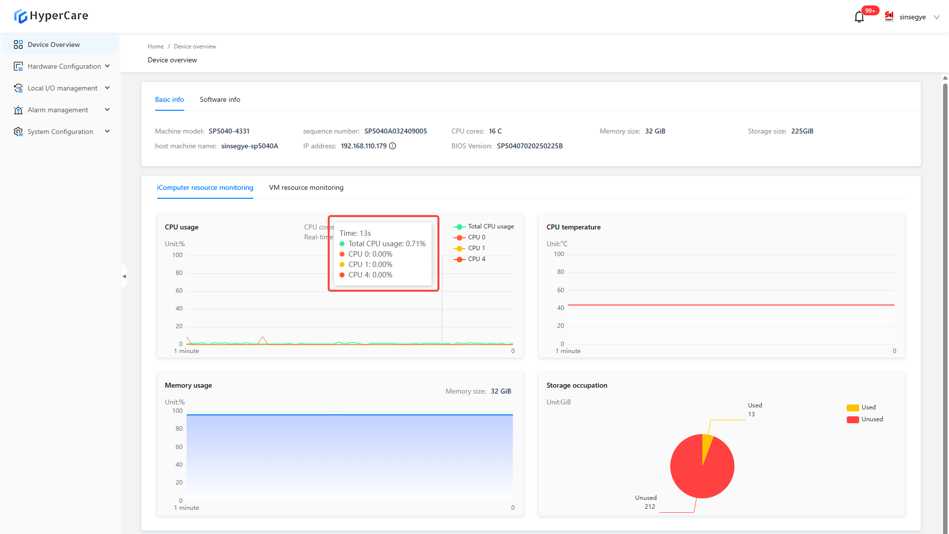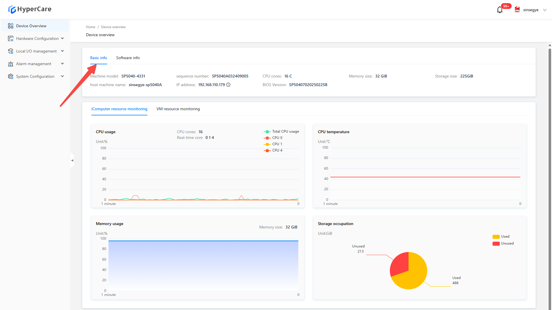 It displays the host's machine model, serial number, number of CPU cores, memory size, storage capacity, host name, IP address, BIOS version, and Cmos battery voltage. Hover the mouse over the \[i] icon to view the detailed information.