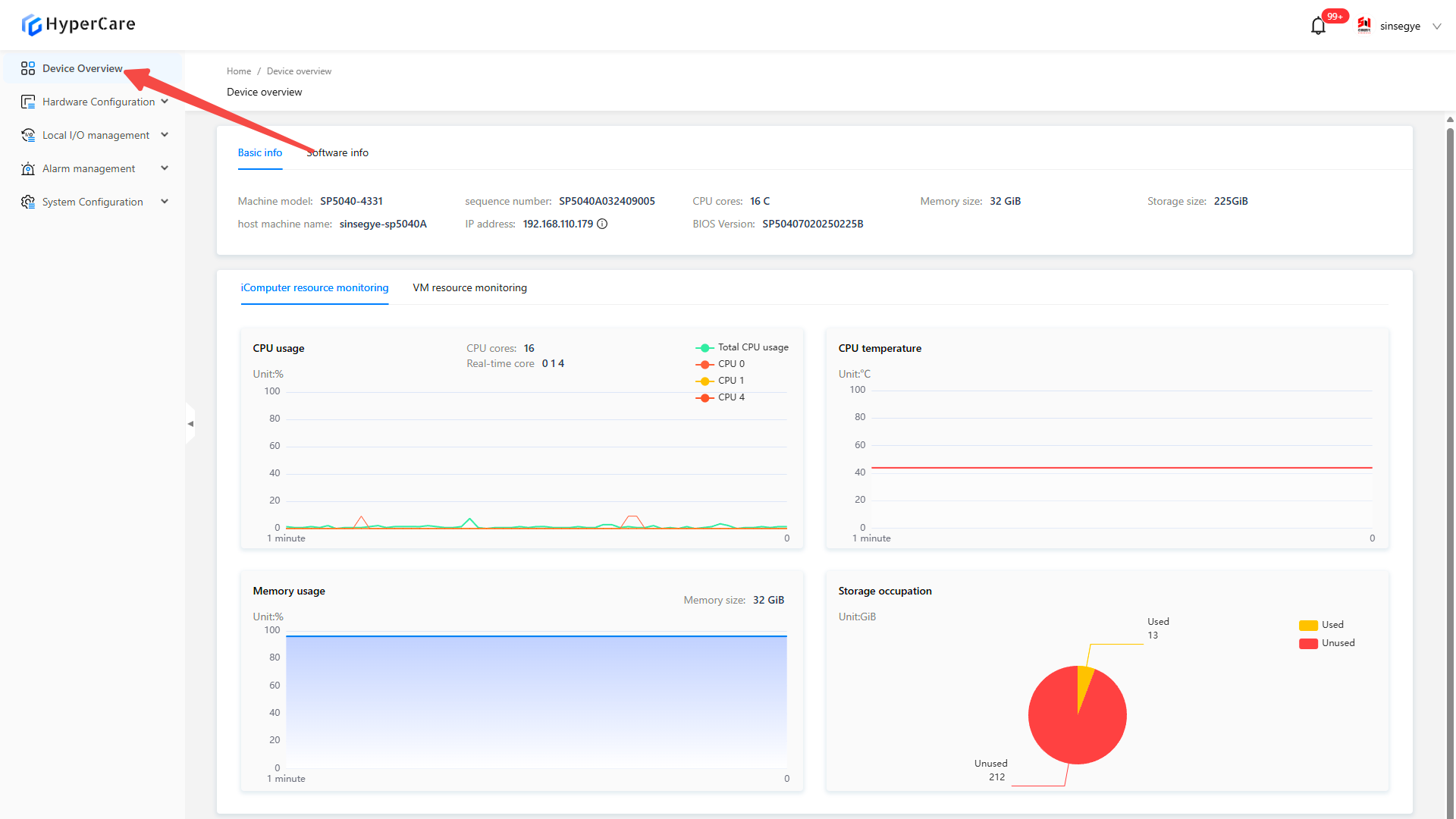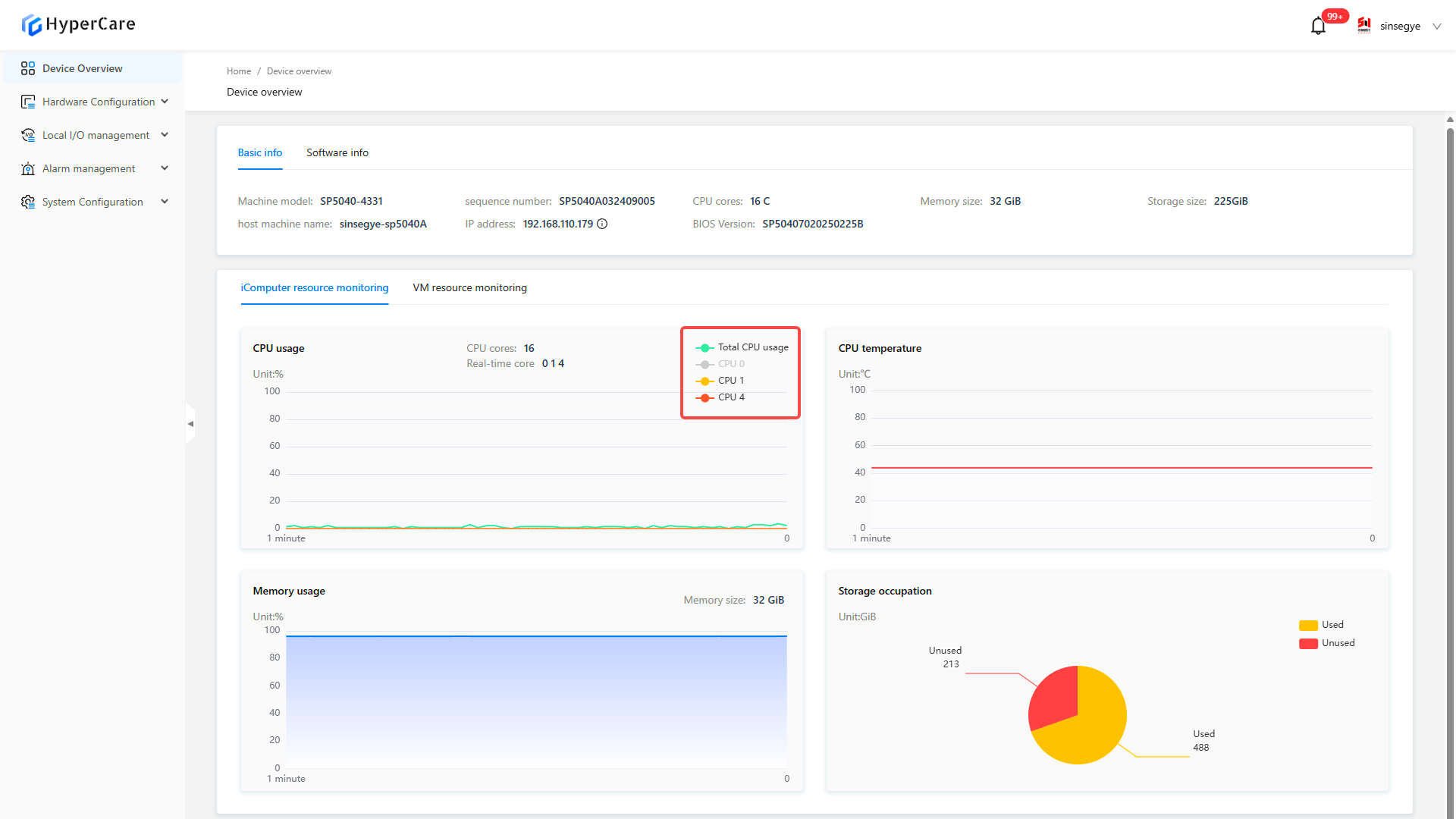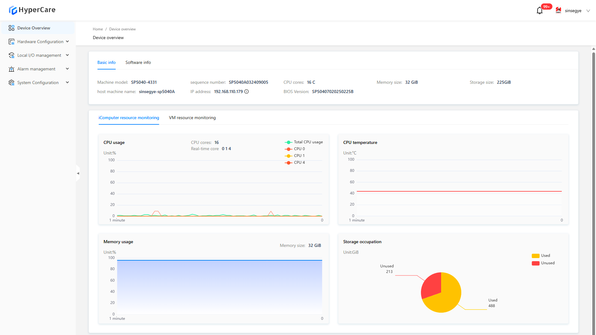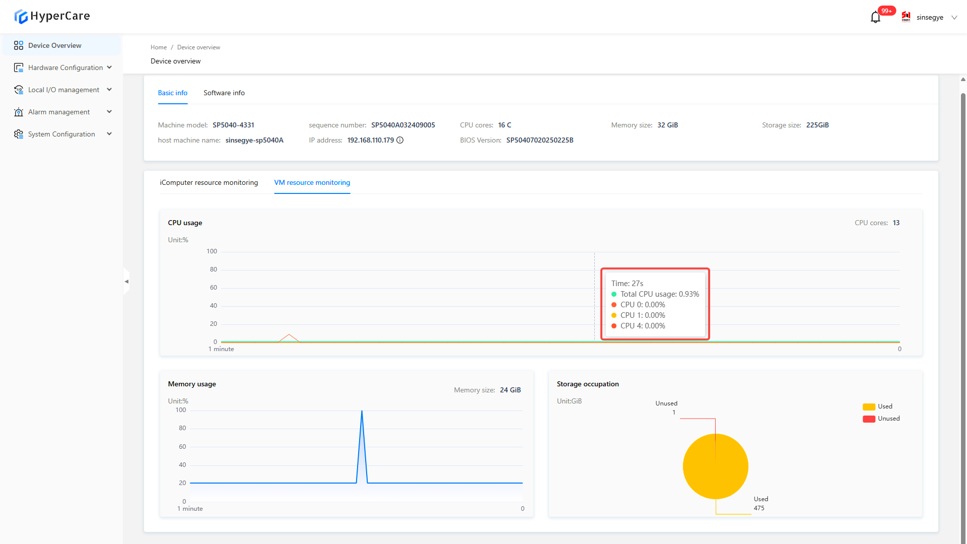 It displays the host's machine model, serial number, number of CPU cores, memory size, storage capacity, host name, IP address, BIOS version, and Cmos battery voltage. Hover the mouse over the \[i] icon to view the detailed information.