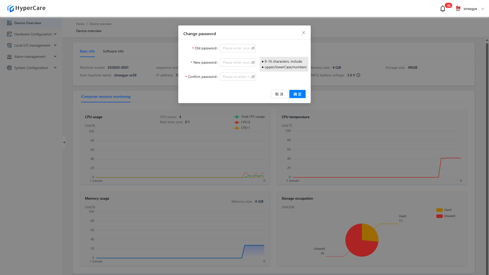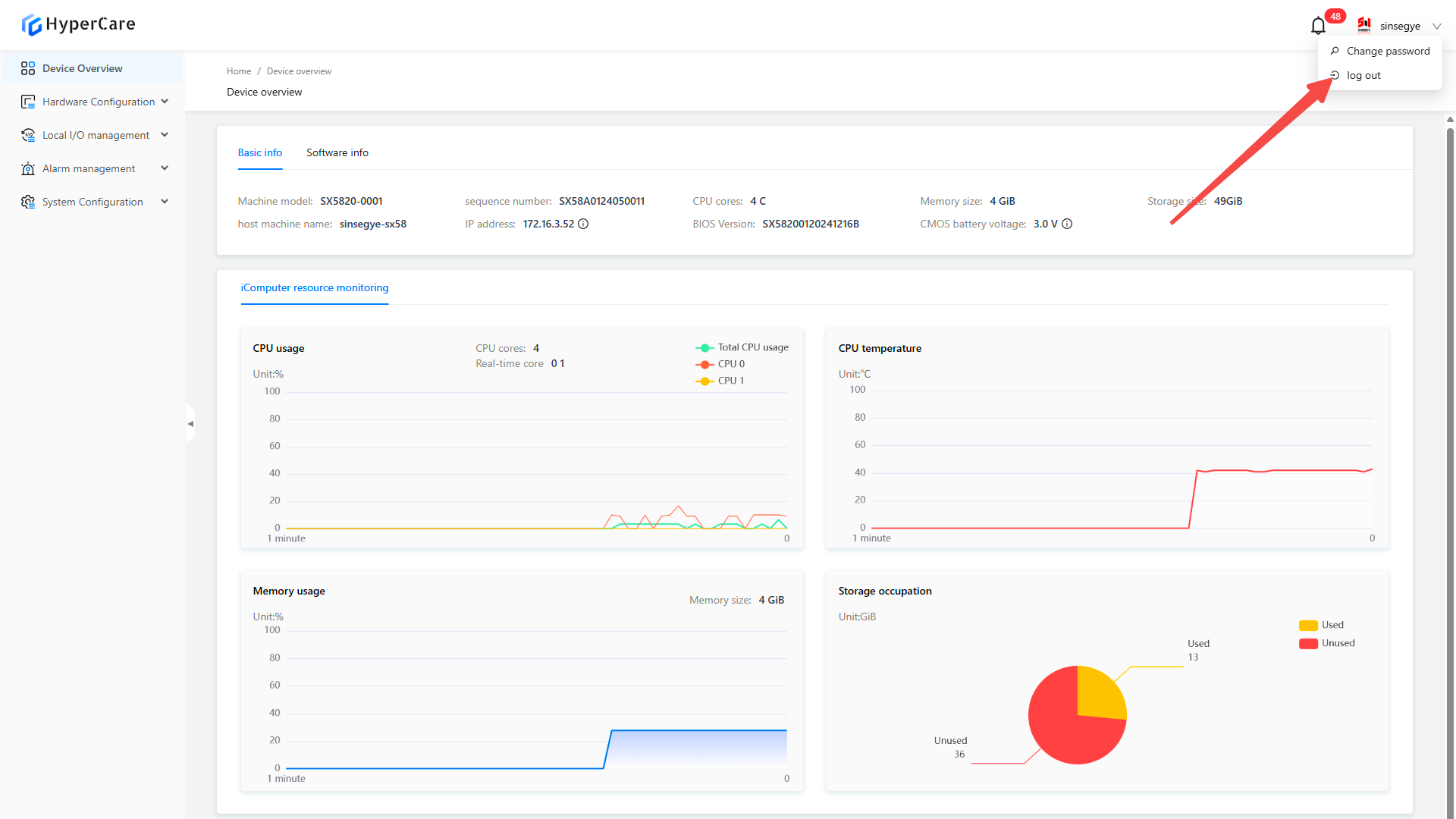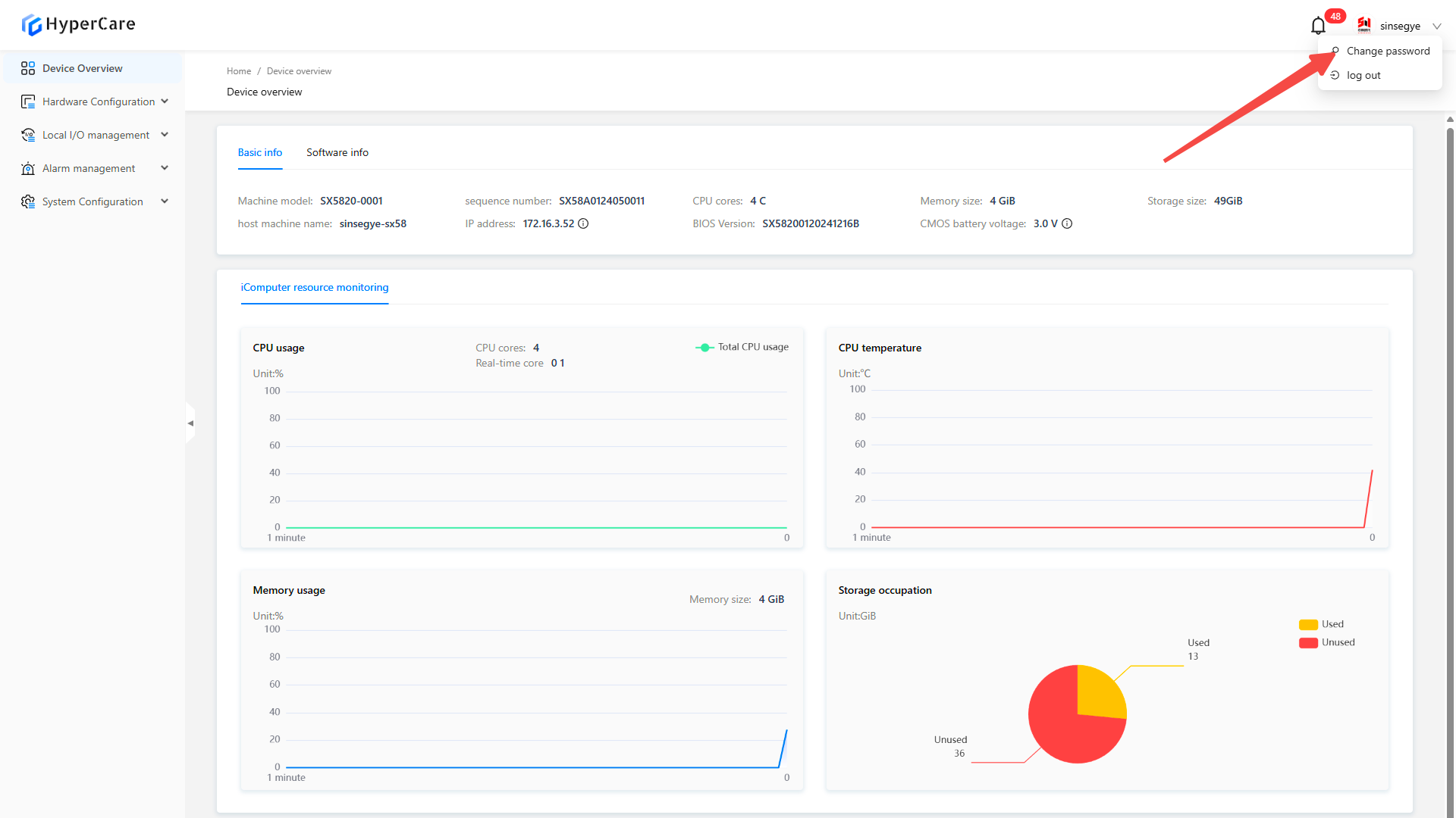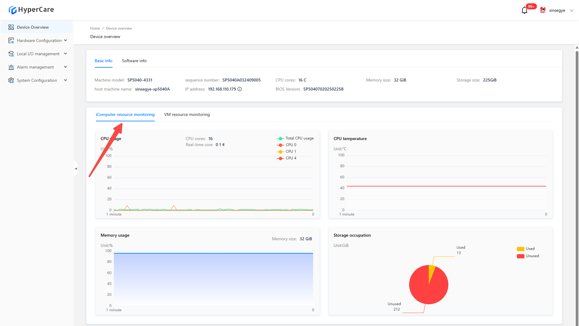 It displays the host's machine model, serial number, number of CPU cores, memory size, storage capacity, host name, IP address, BIOS version, and Cmos battery voltage. Hover the mouse over the \[i] icon to view the detailed information.