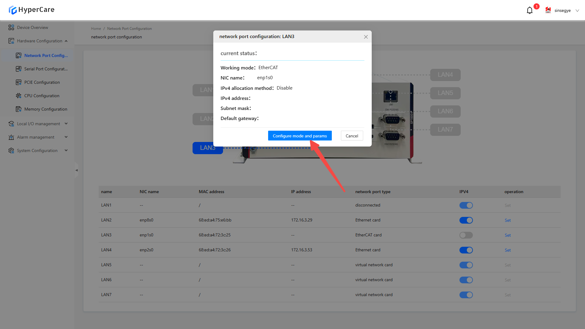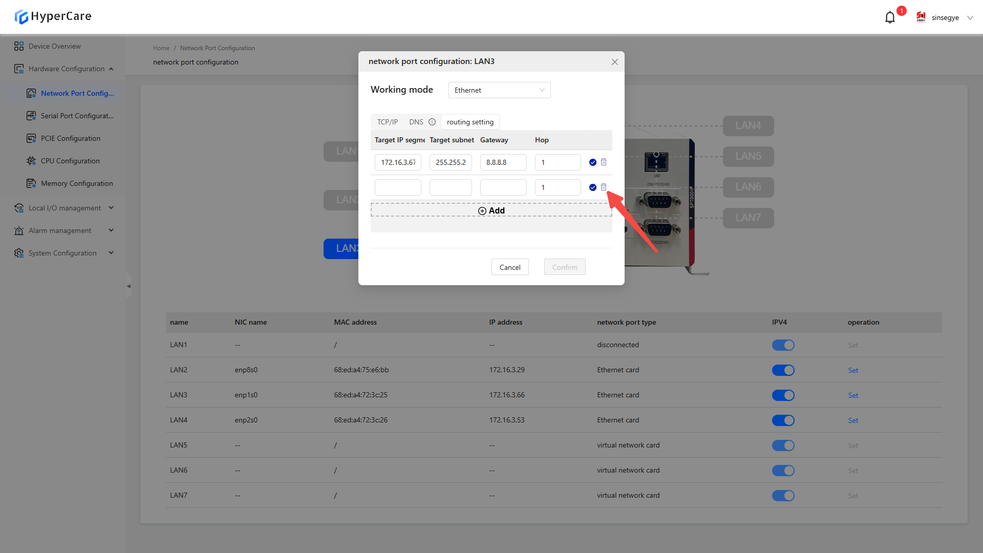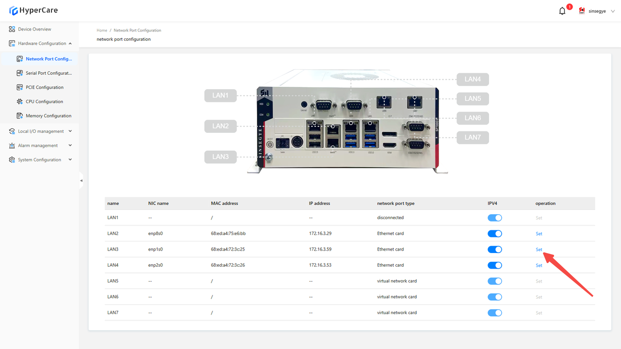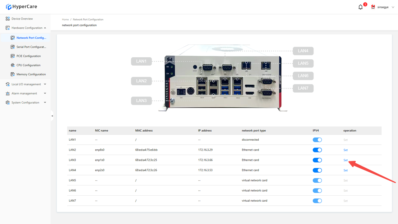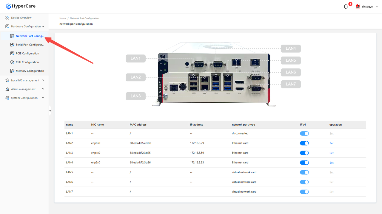 Based on LANx, return to the \[Network Port Configuration] page to view the correspondence in the port information (or directly corresponding to the LANx printed on the physical device).