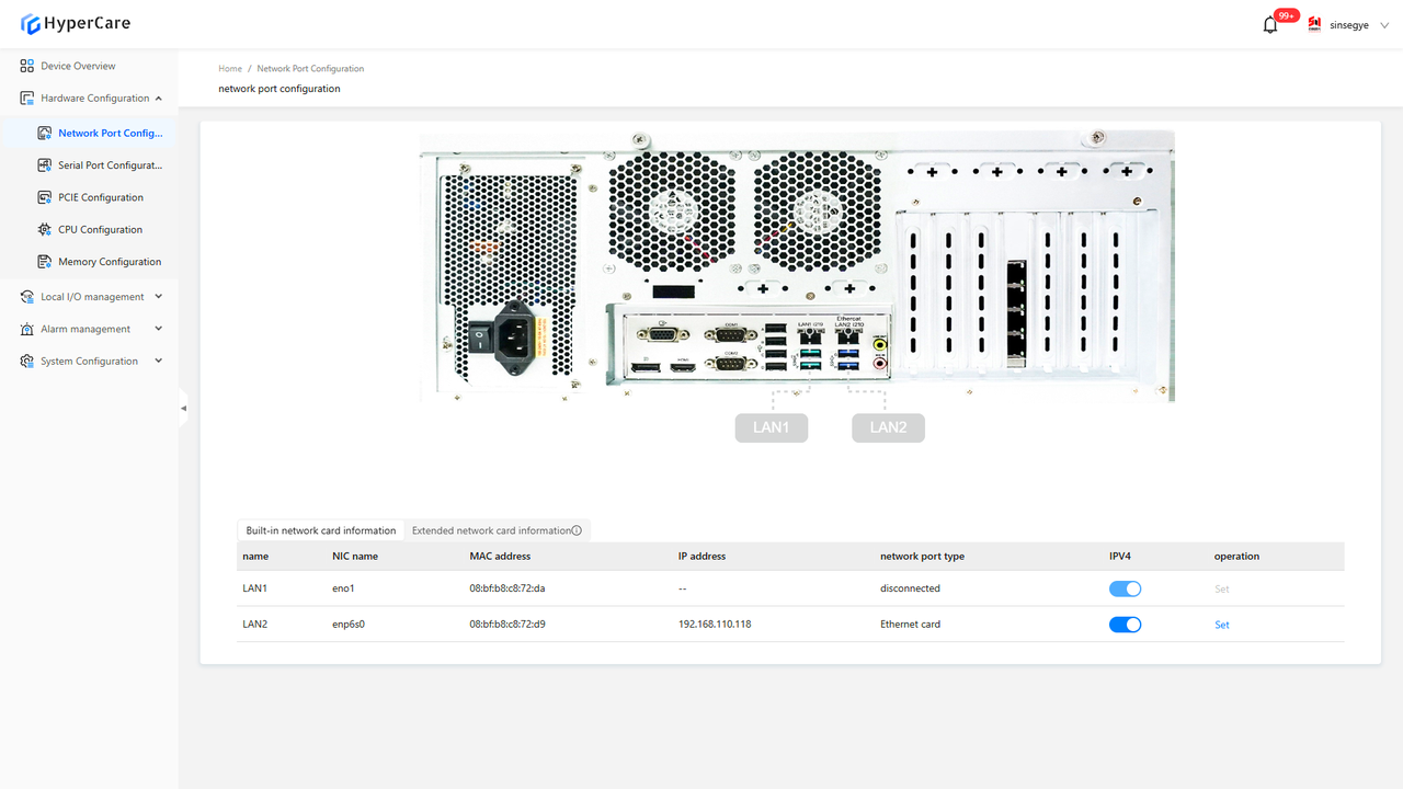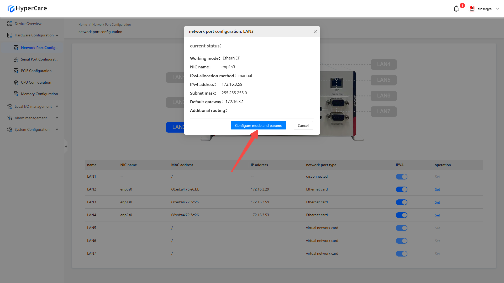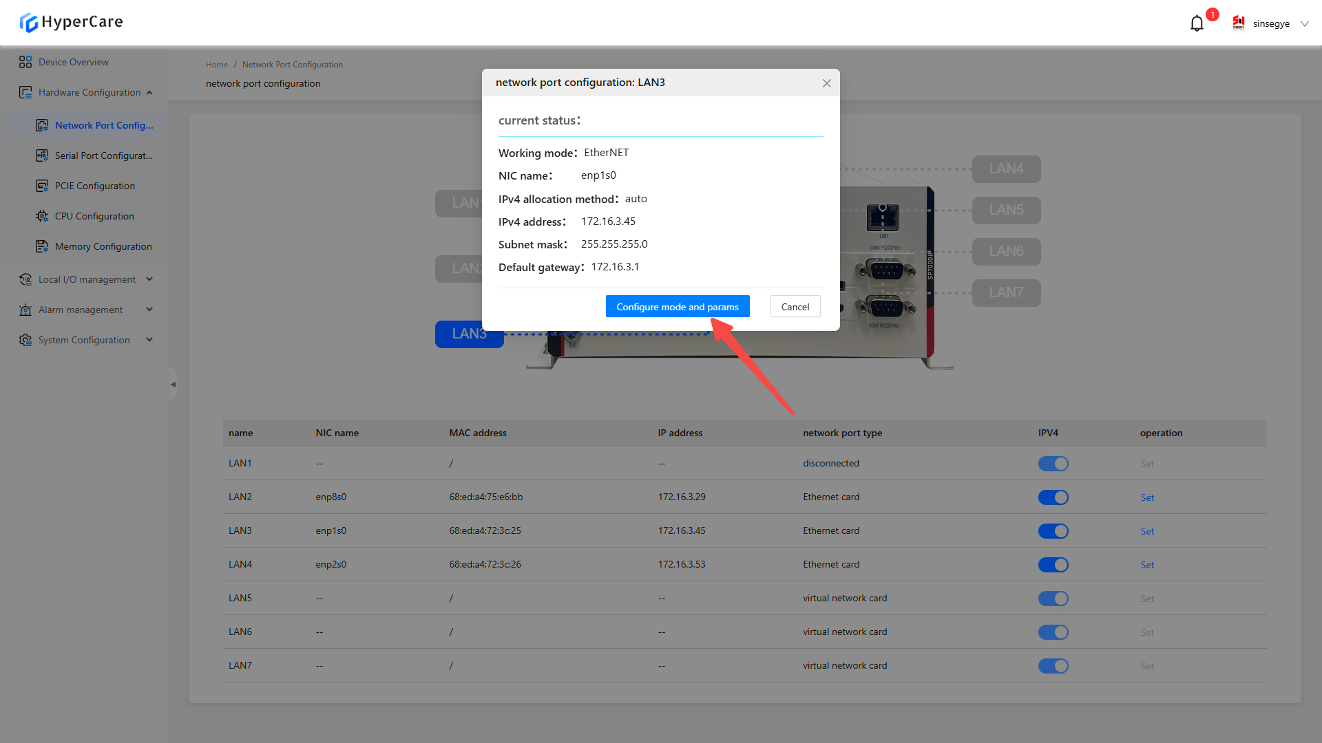 View the detailed information such as LAN name, NIC name, MAC address, IP address, and network port type.