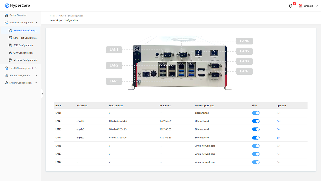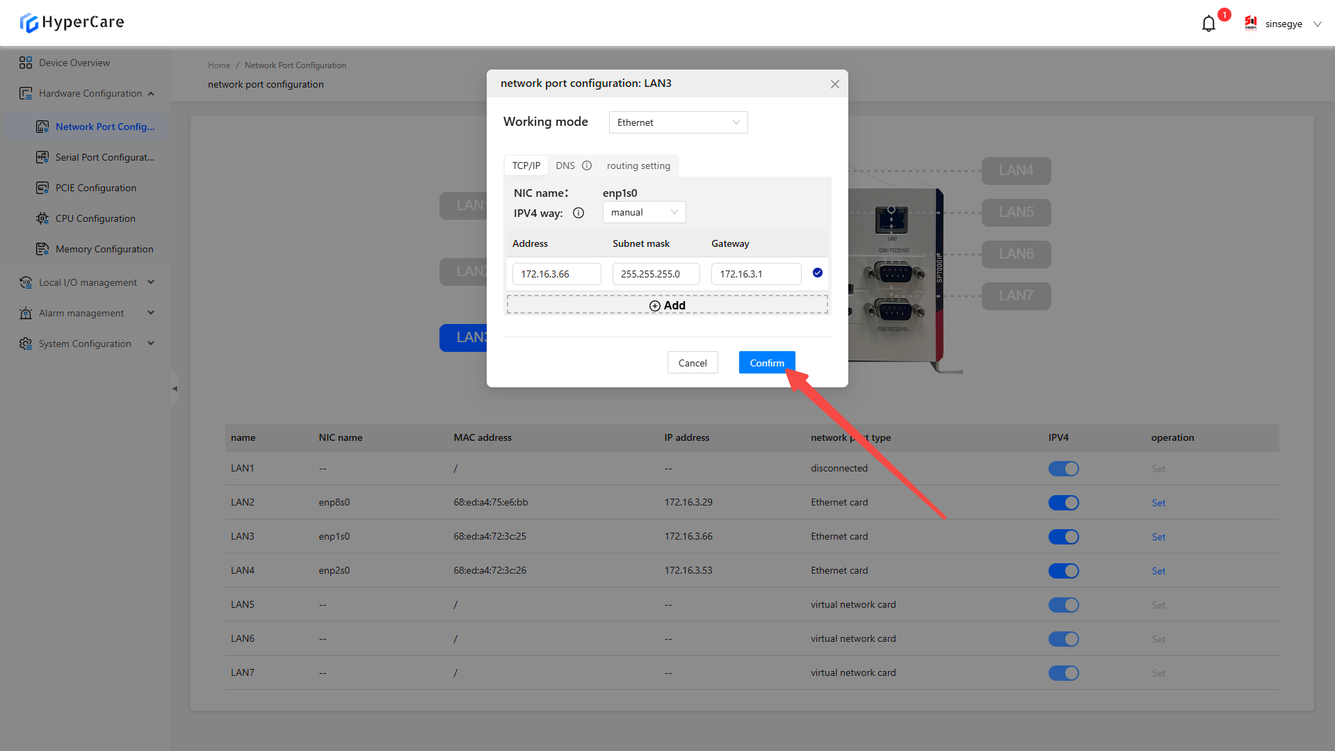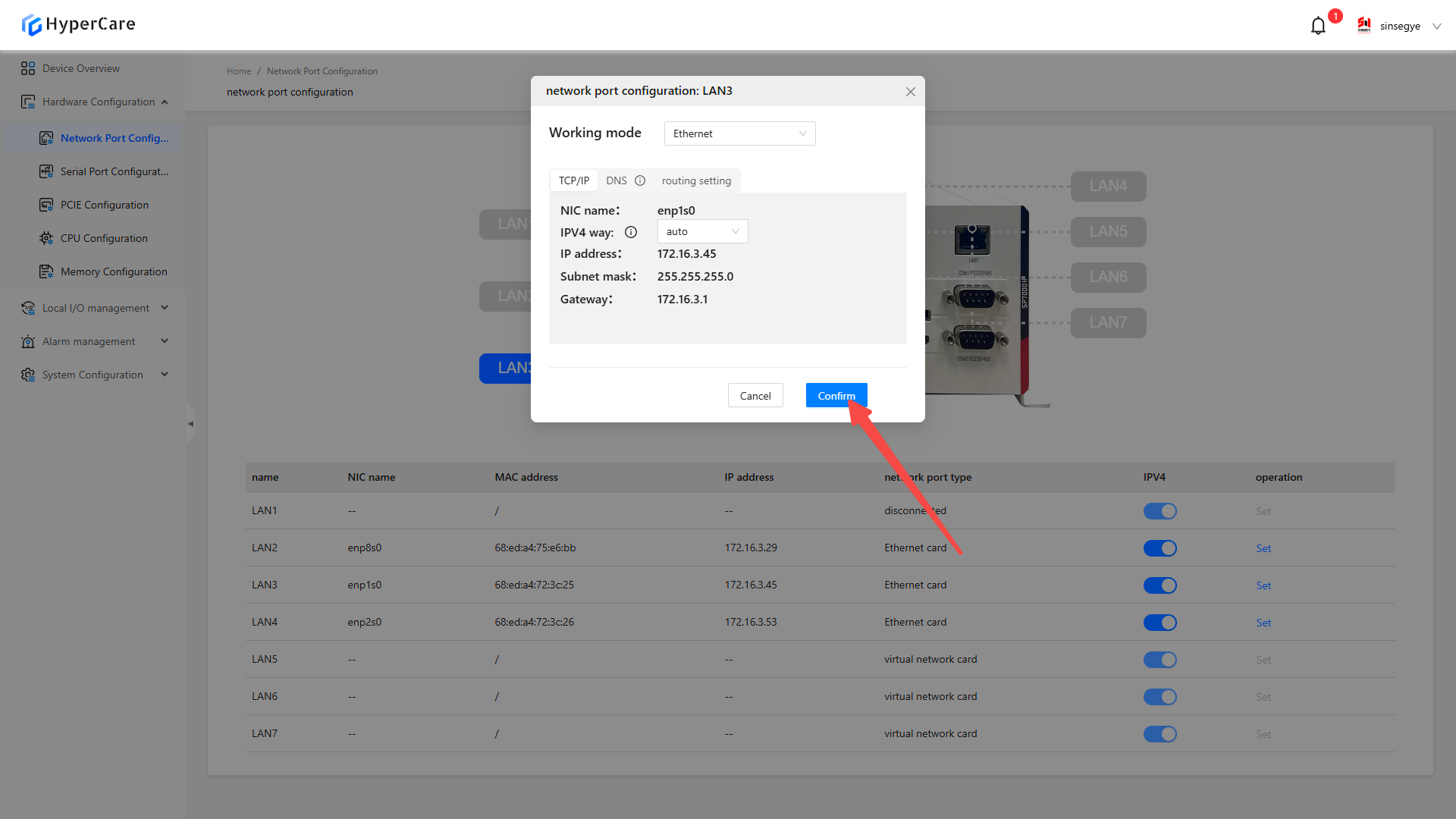 View the detailed information such as LAN name, NIC name, MAC address, IP address, and network port type.