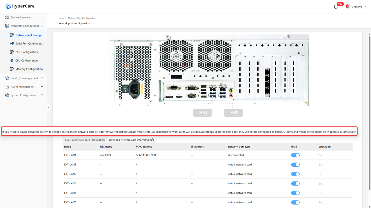 This page displays network interface card (NIC) information in real-time domains and supports custom configurations such as EtherCAT, IP, DNS, and routing for NIC.