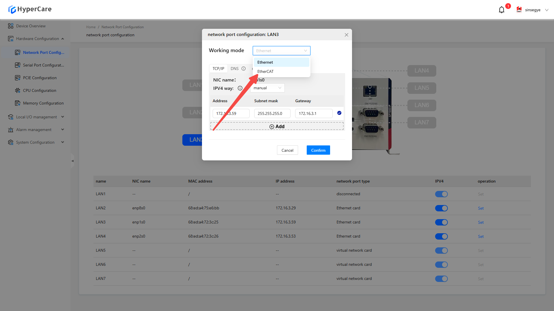 Select \[Ethernet] as the working mode, with IP set to automatic by default, or to be configured manually.