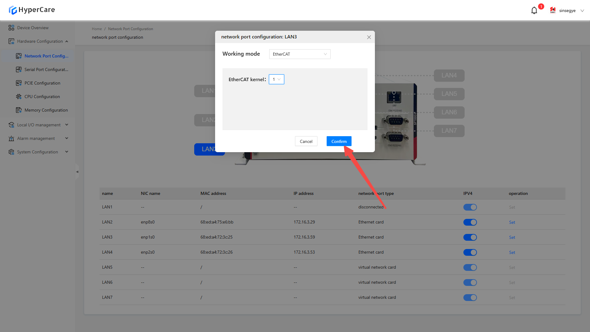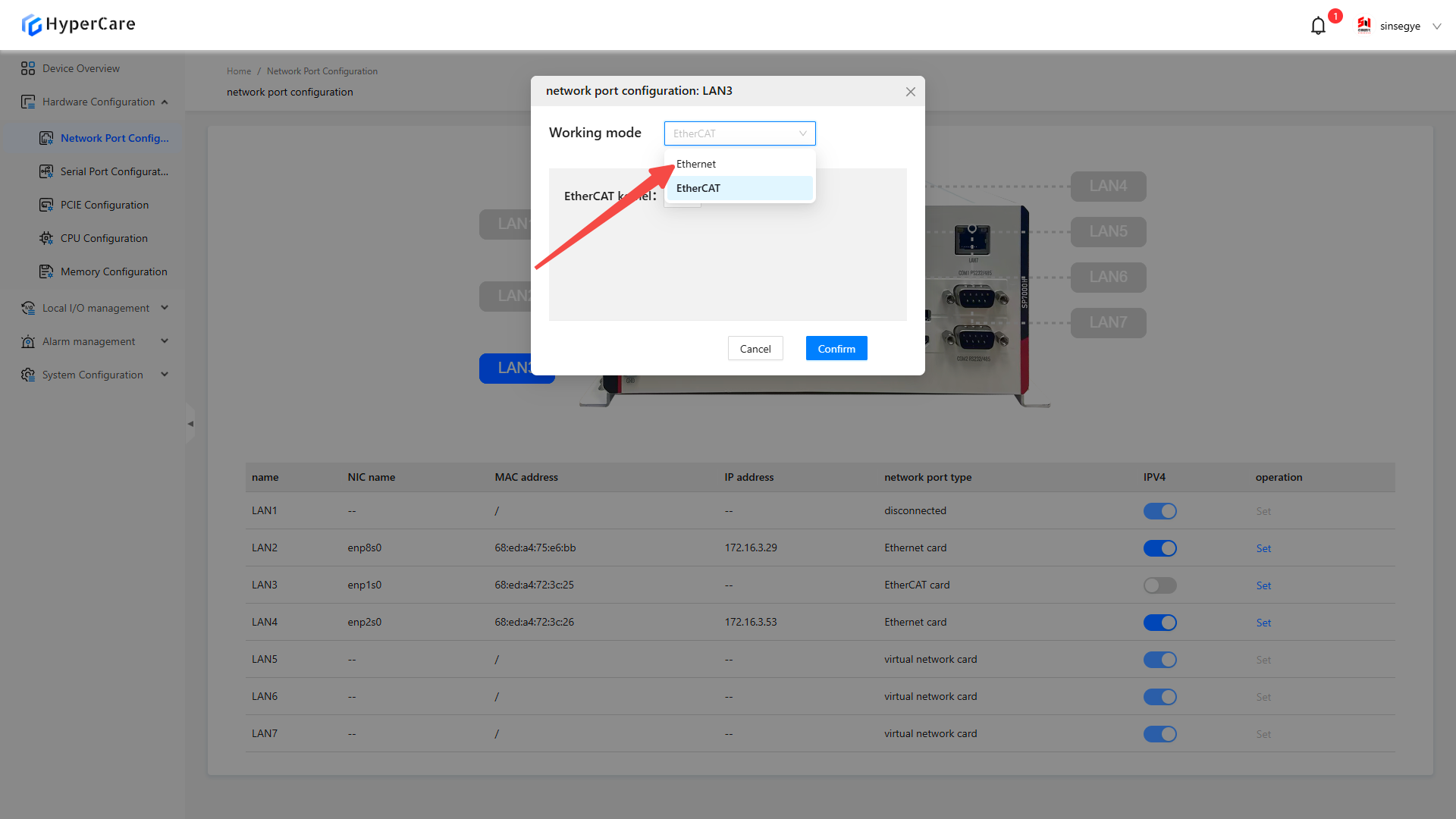The LAN1 NIC is the management port and cannot be configured for EtherCAT. |