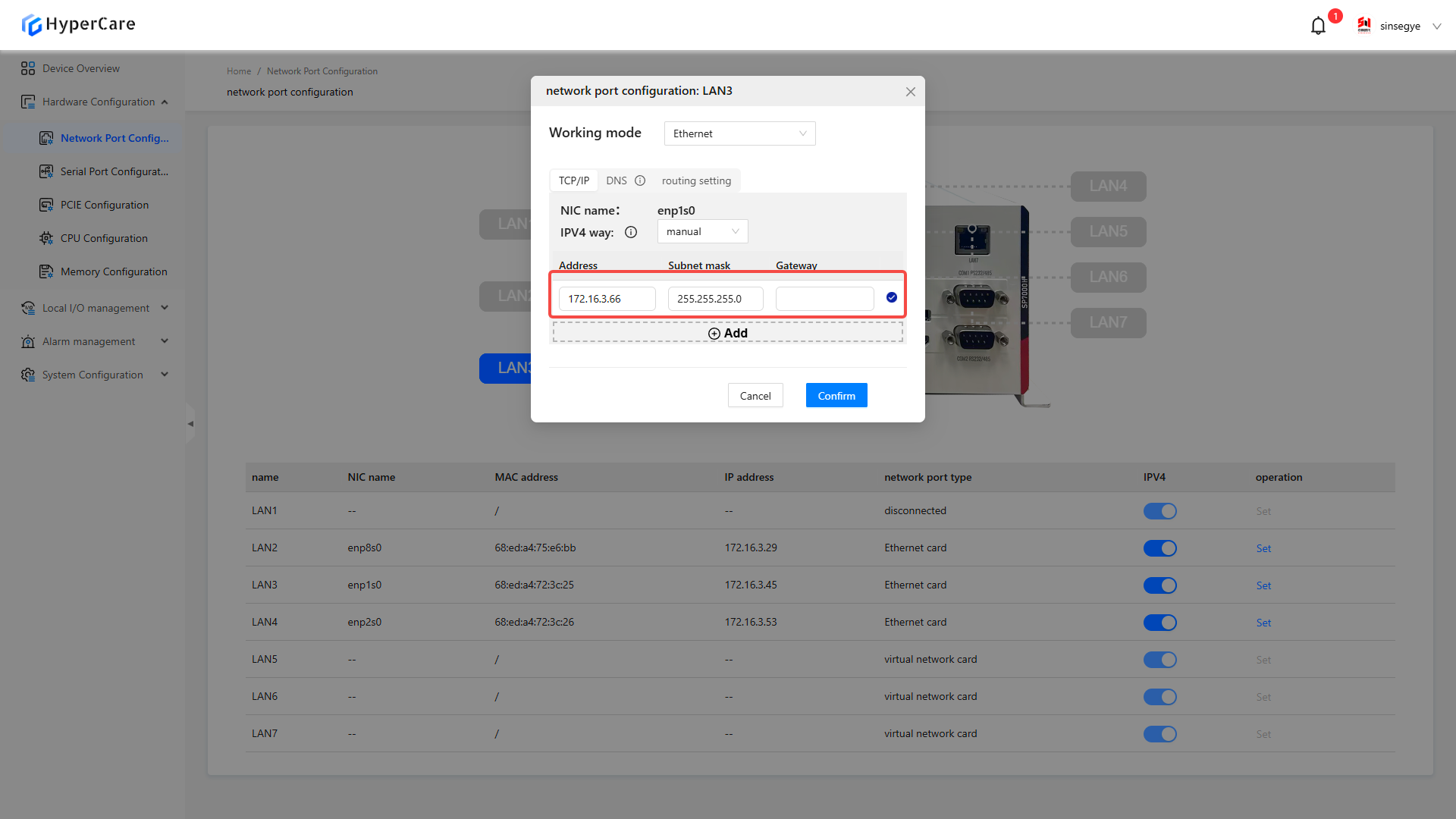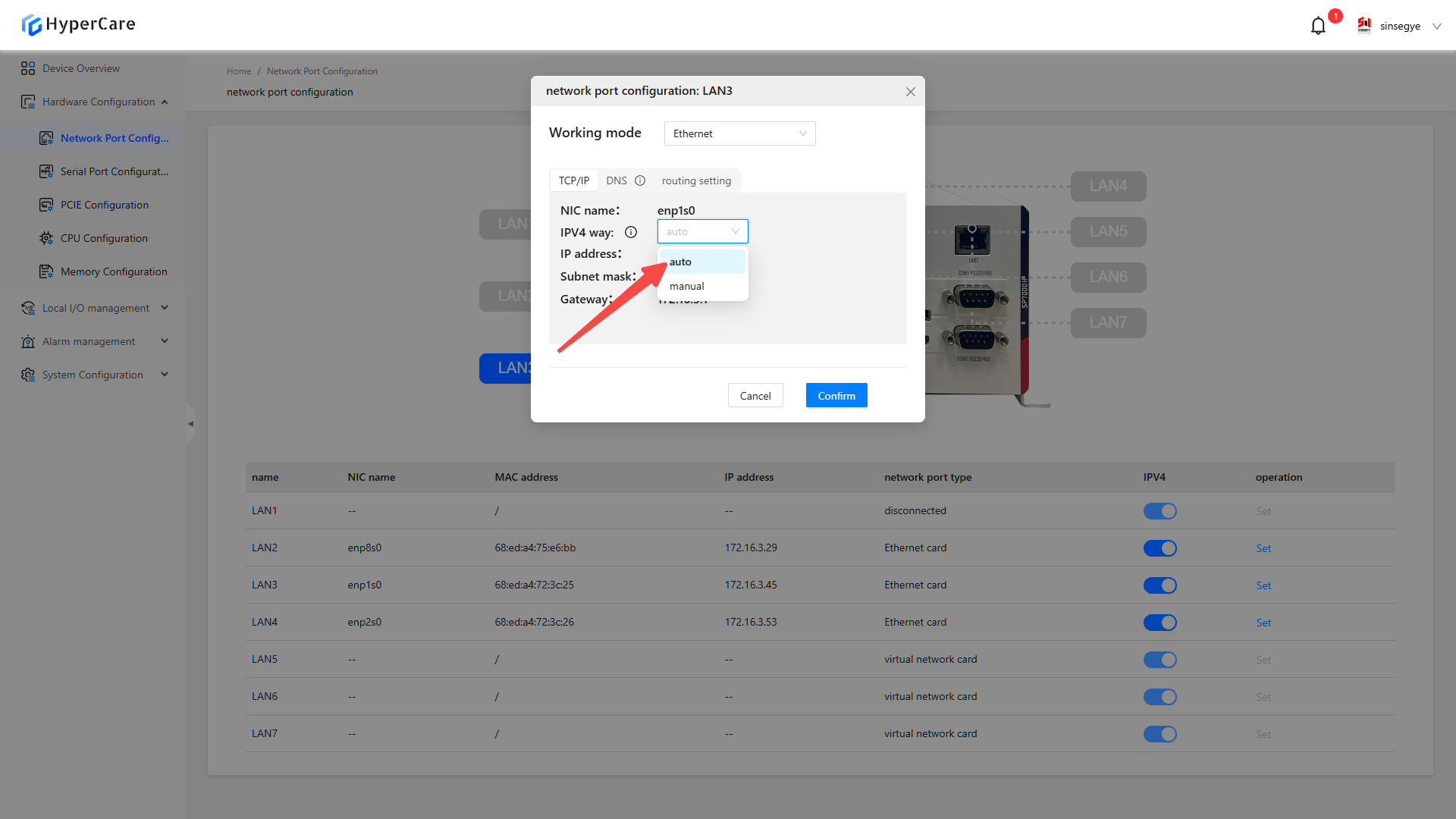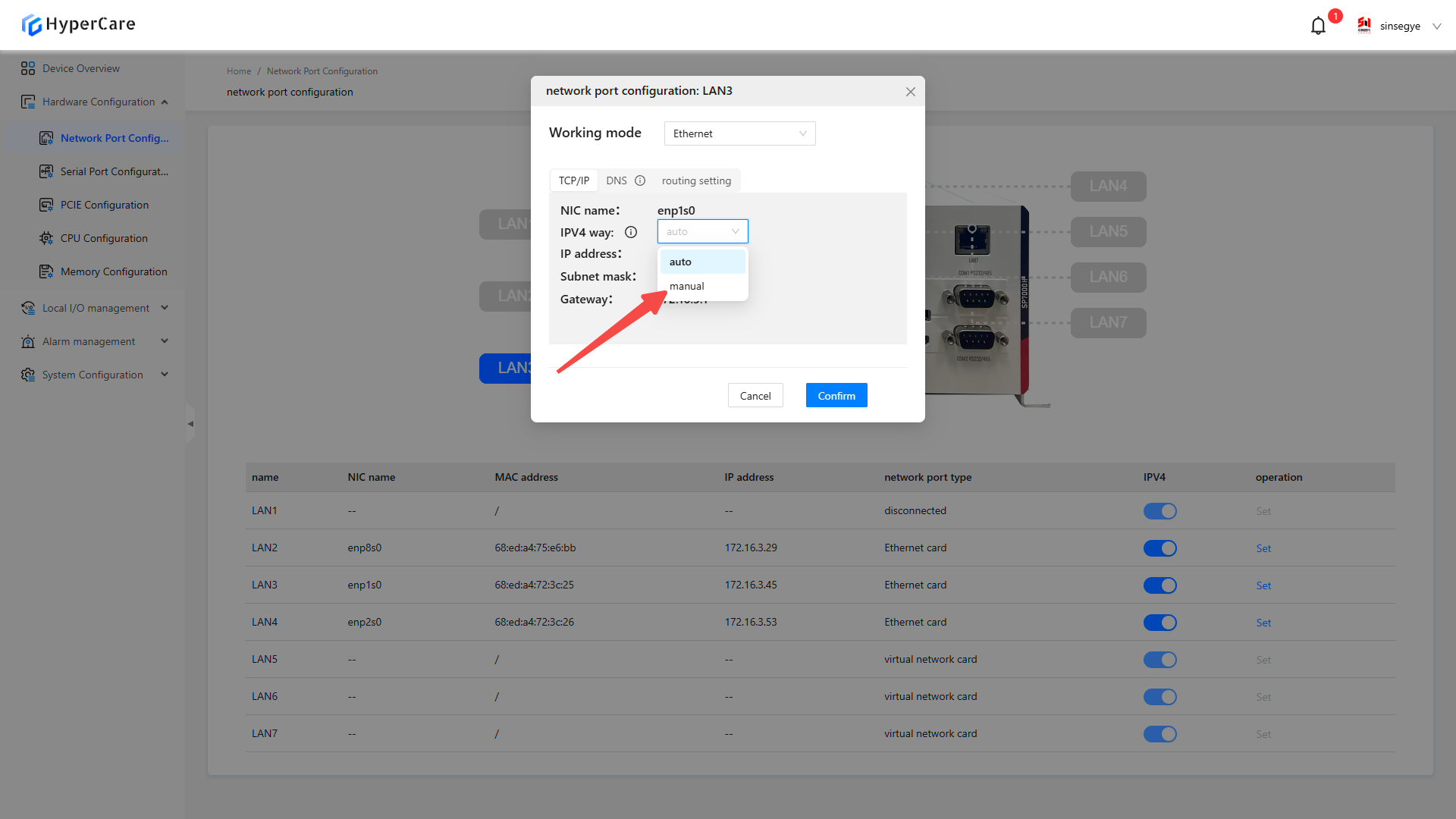 When changing \[IPv4 Mode] to \[Manual], the system will display configuration items for gateway, IP address, and subnet mask.