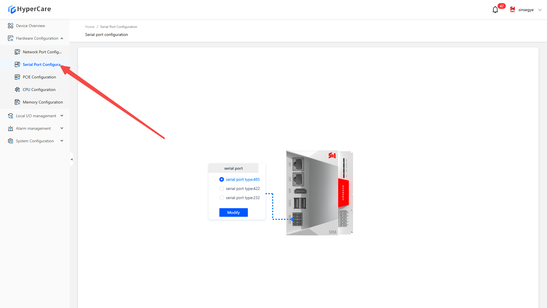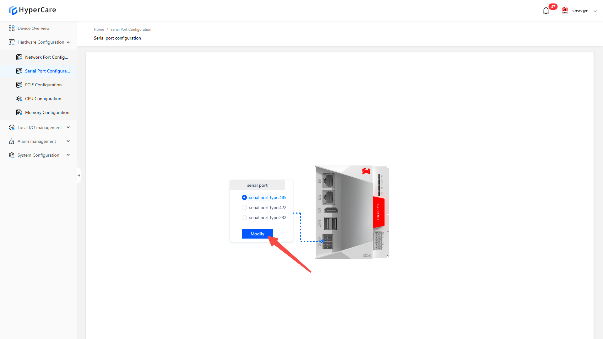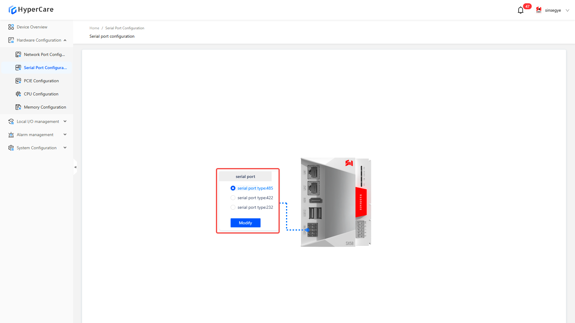 Select the corresponding serial port type \[485/422/232] based on on-site requirements.