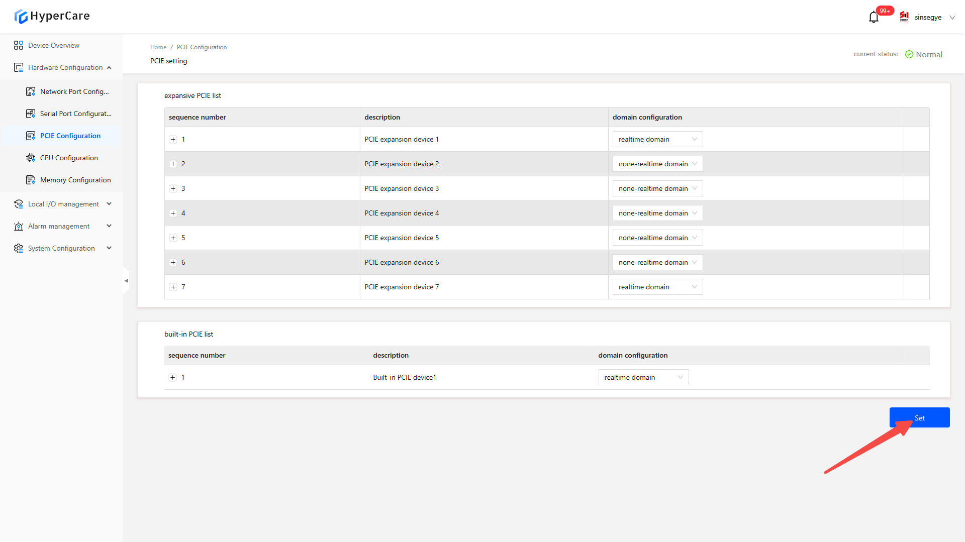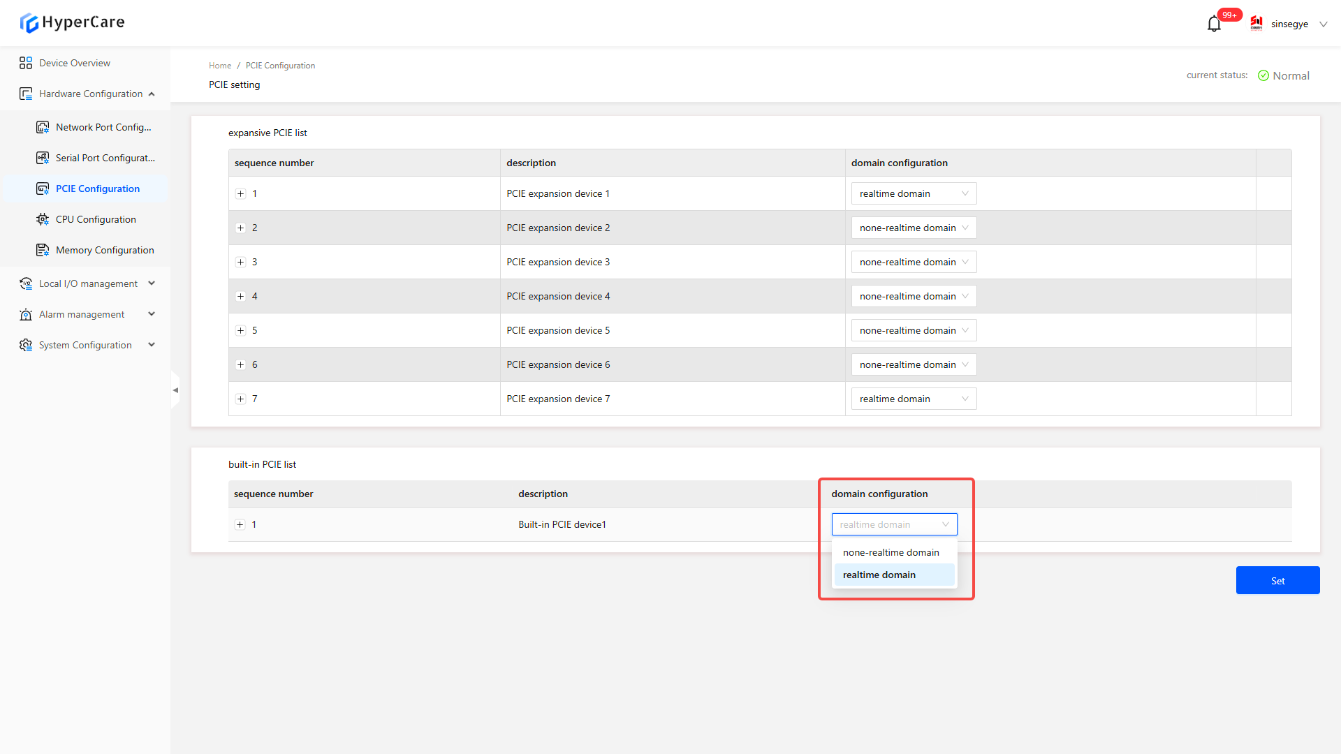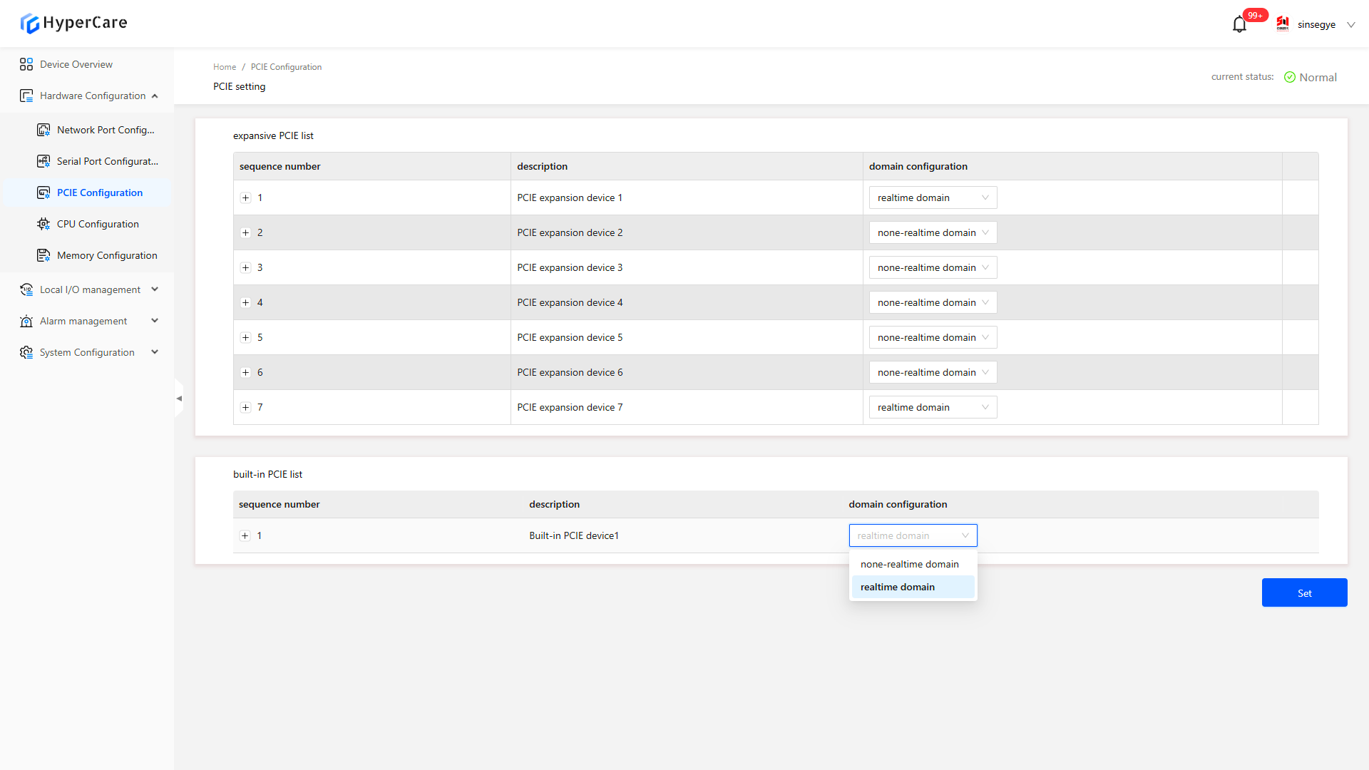 Select the NIC to configure, click the dropdown menu, and modify the domain configuration to \[Real-time Domain] or \[Non-Real-Time Domain].