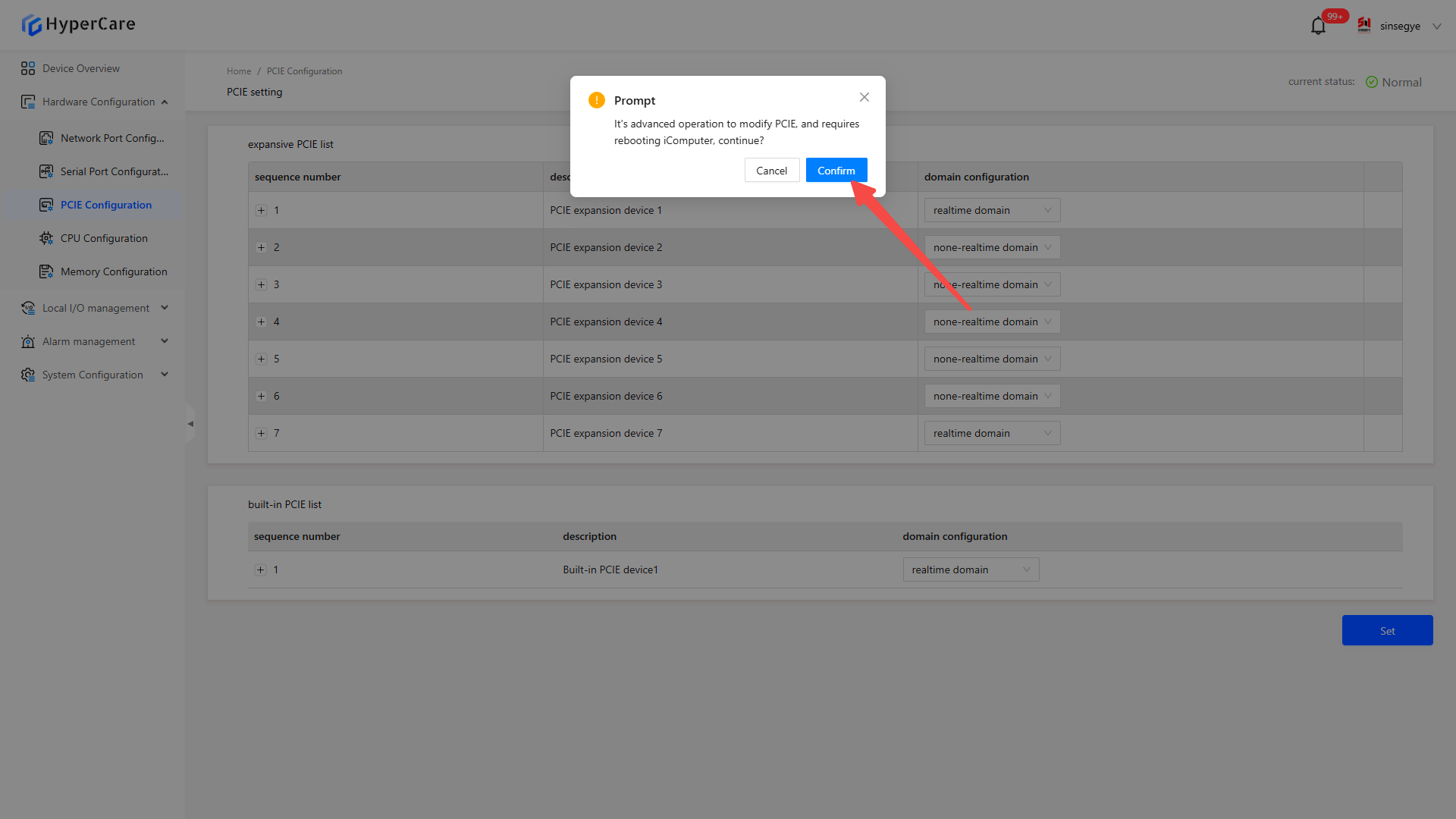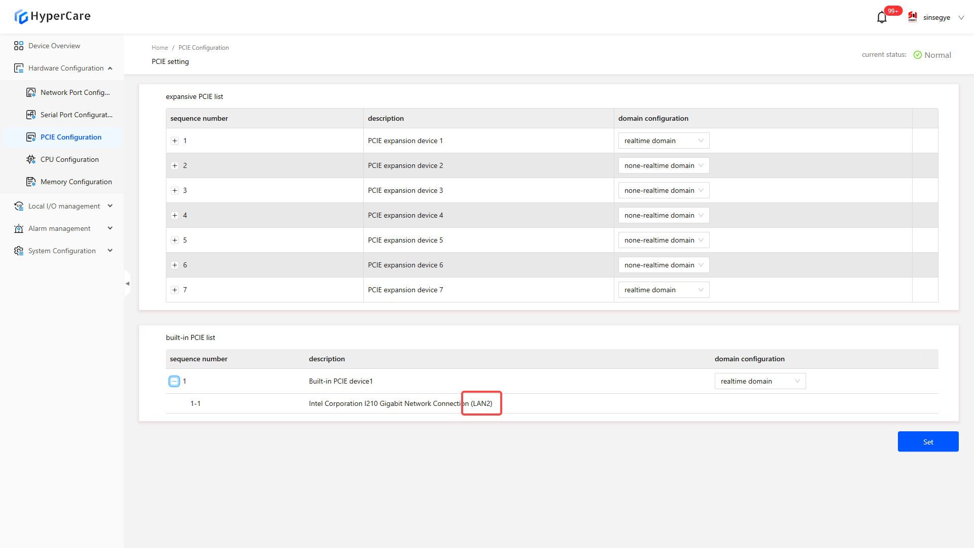 The built-in PCIE list displays the integrated built-in NIC of the iComputer. Users can modify domain configurations and select a corresponding NIC to use in the non-real-time domain (Windows) or real-time domain (Linux).