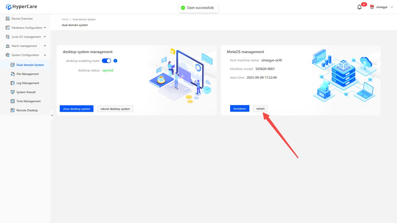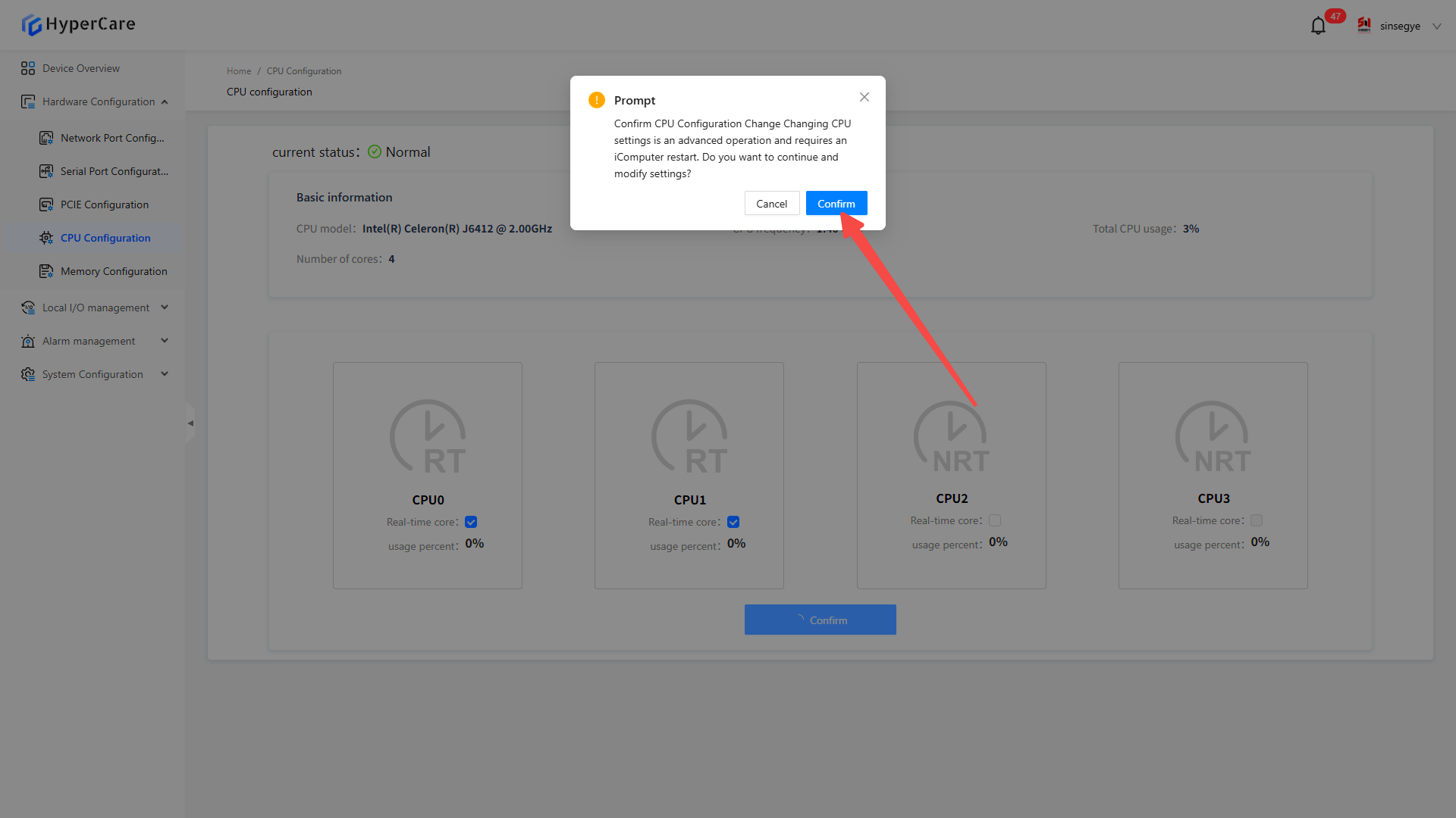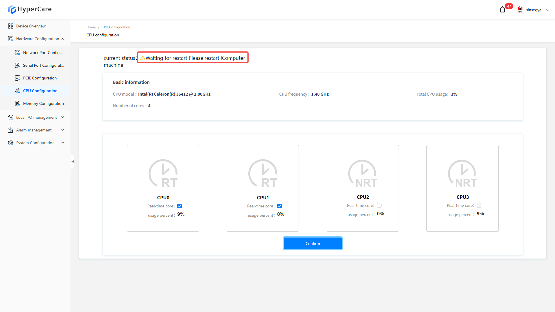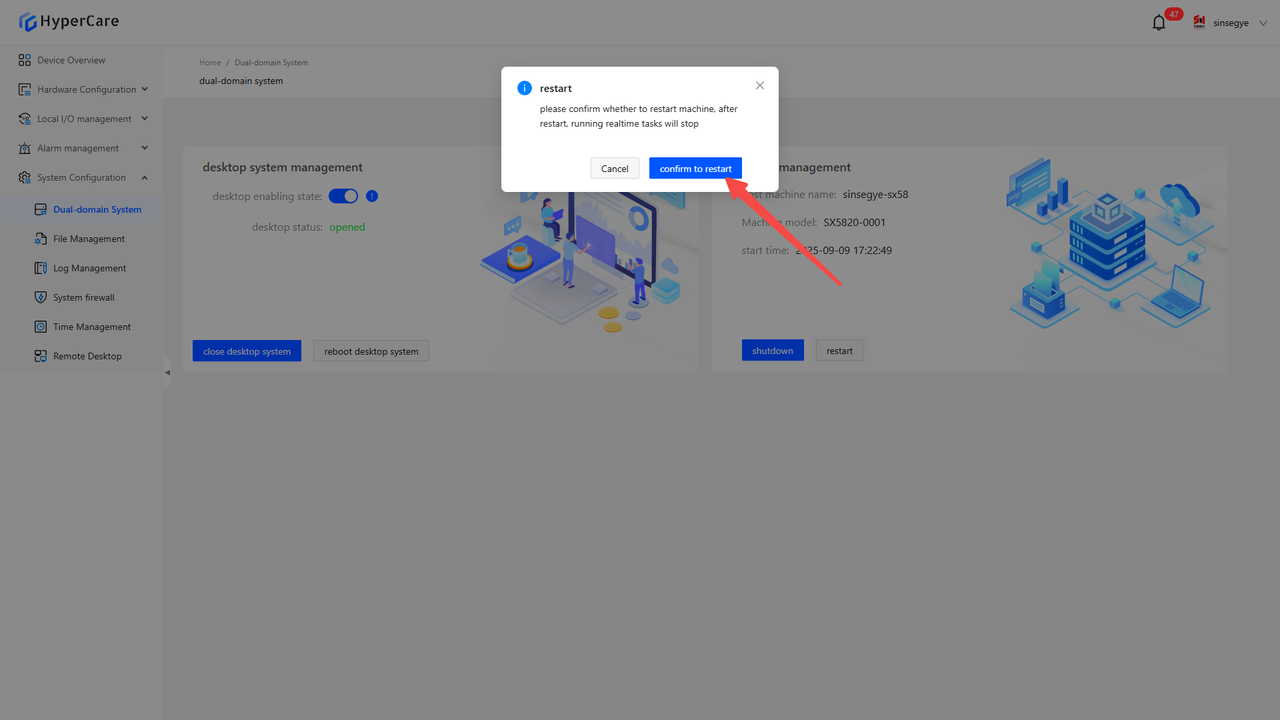 Clicking \[Confirm Restart] will restart the non-real-time domain system (desktop) while keeping the real-time domain system running normally.