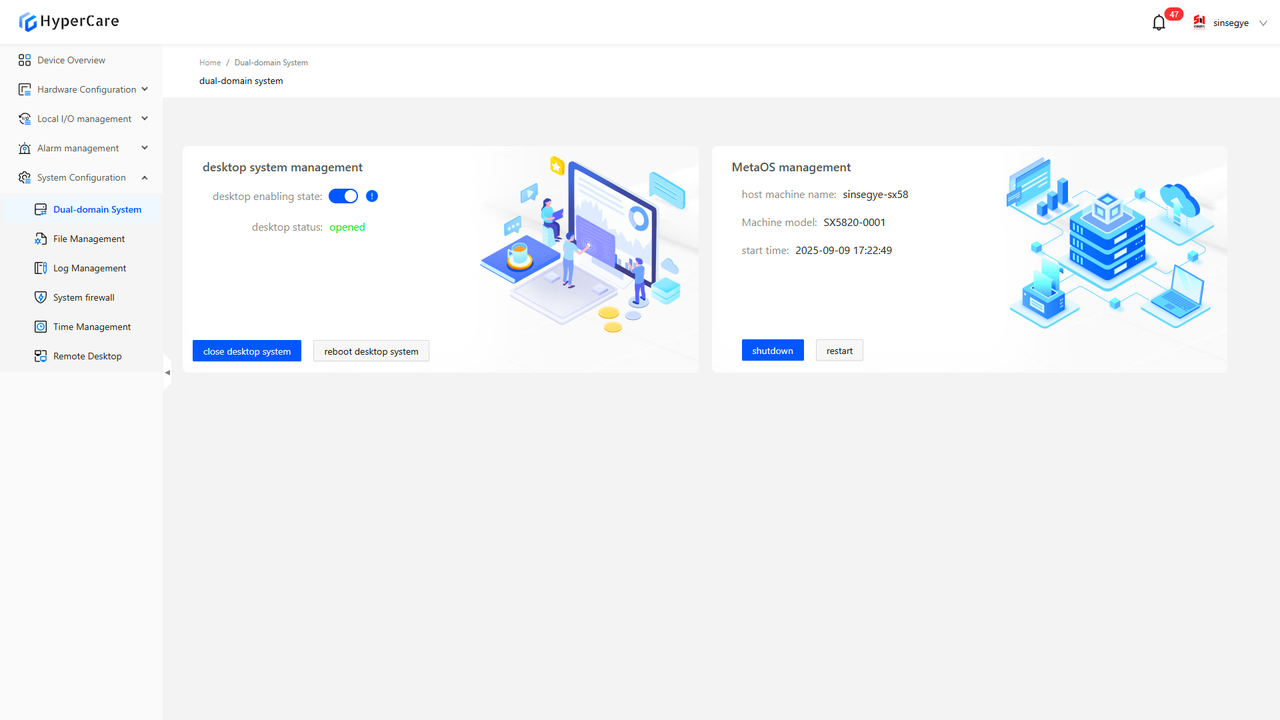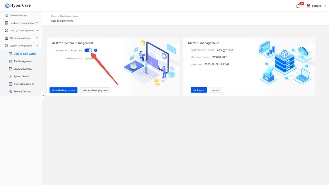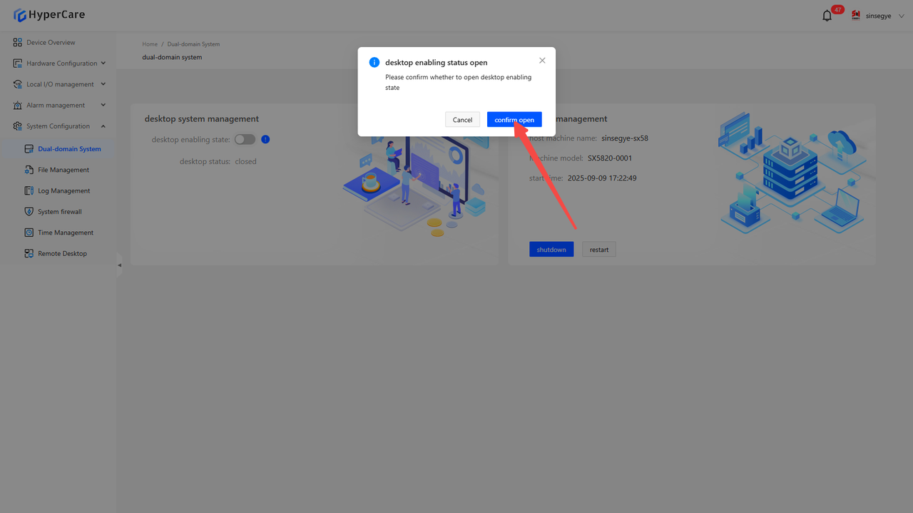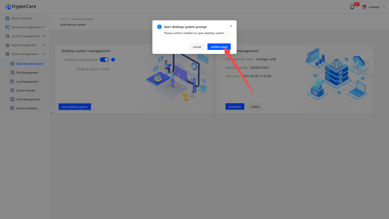 Clicking the \[Confirm ON] button will start the non-real-time domain system (desktop) and support power-on, shutdown, and restart operations.