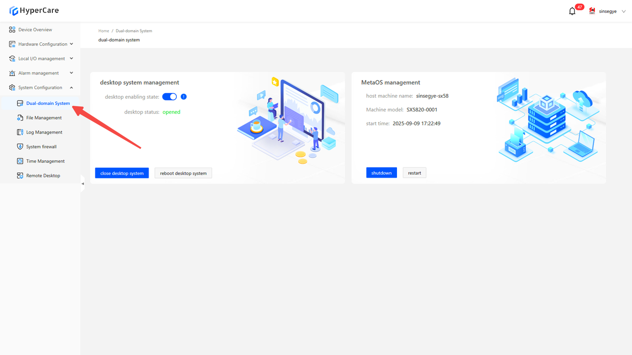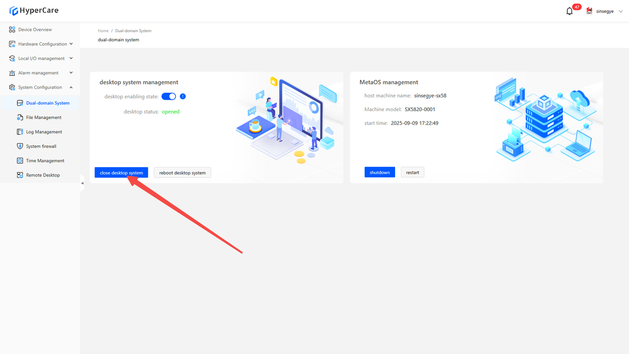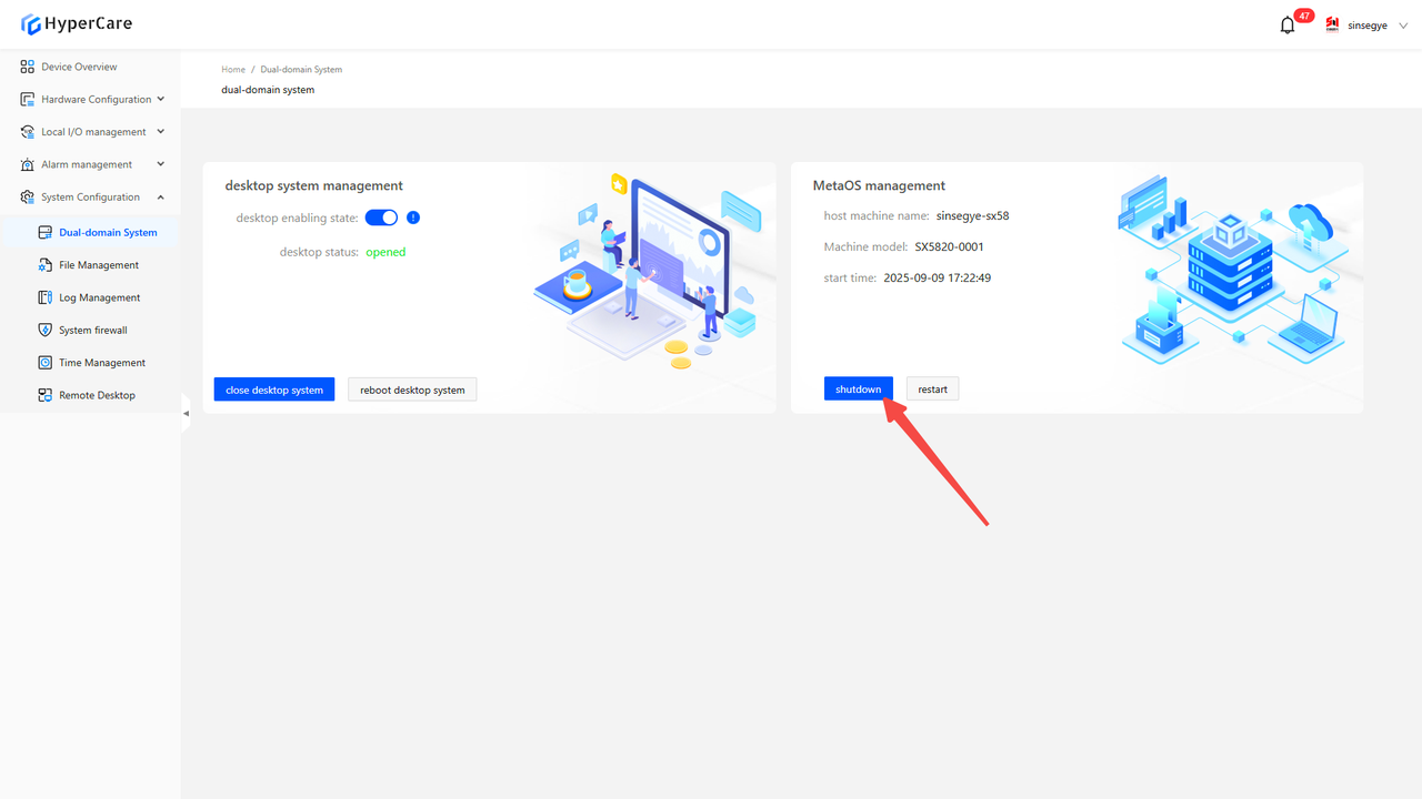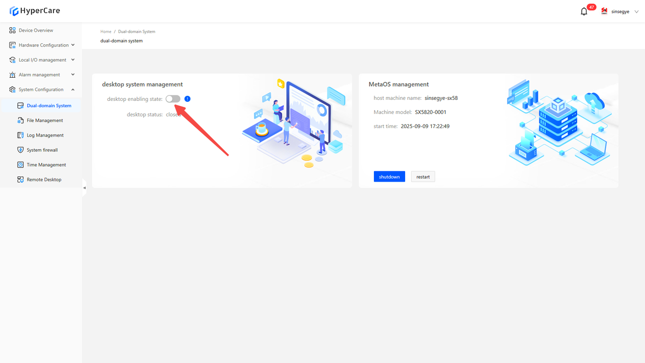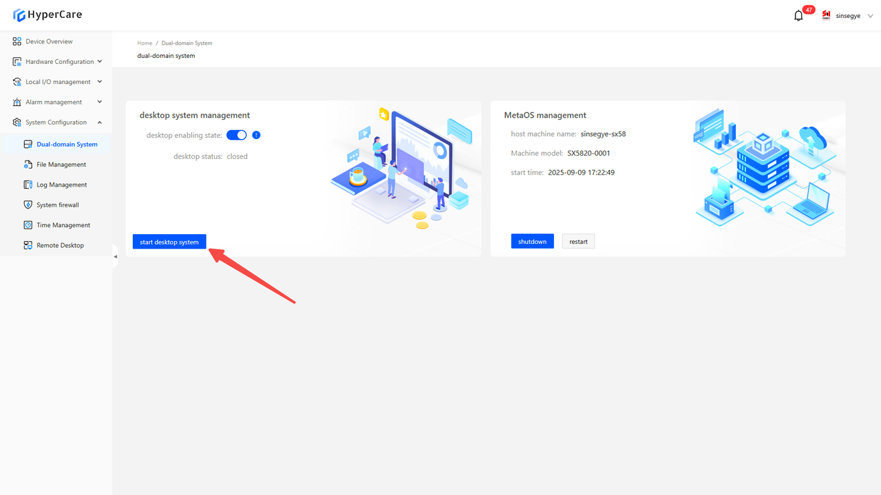 Clicking the \[Confirm ON] button will start the non-real-time domain system (desktop) and support power-on, shutdown, and restart operations.