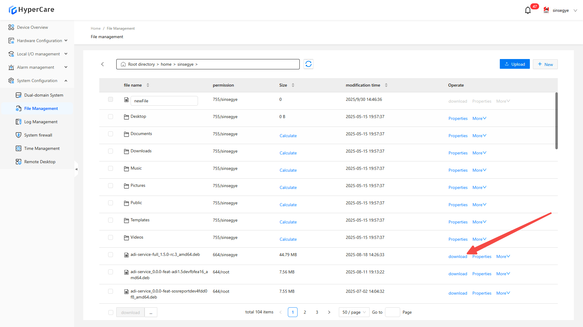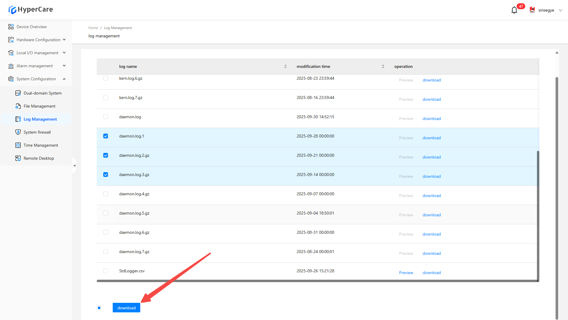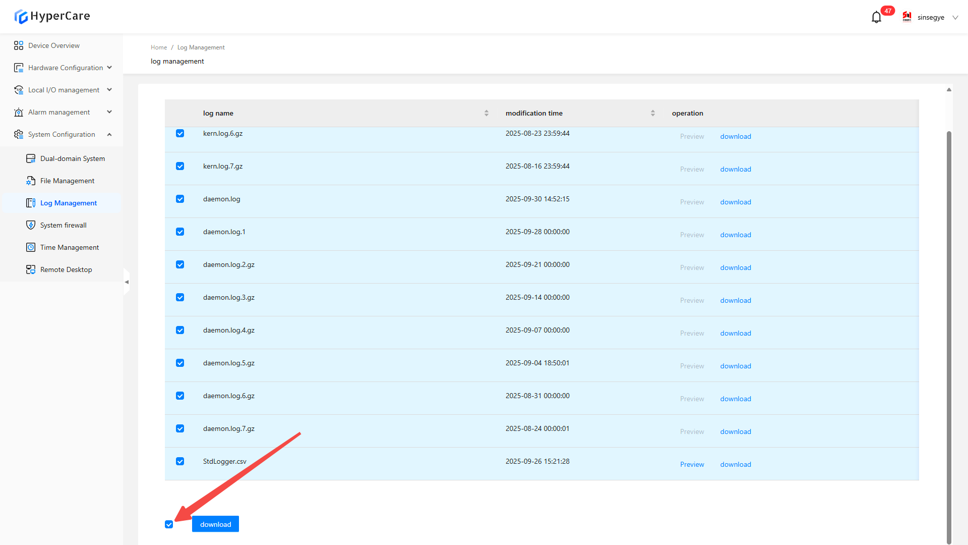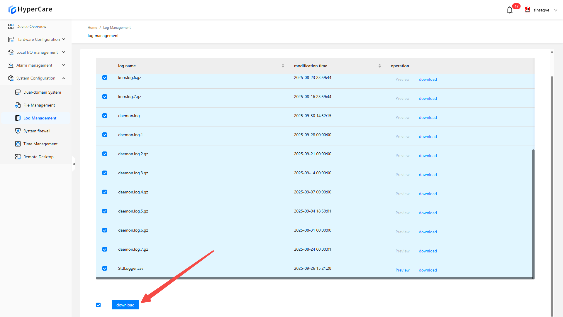 To download a single file, select the desired file and then click the corresponding \[Download] button.
