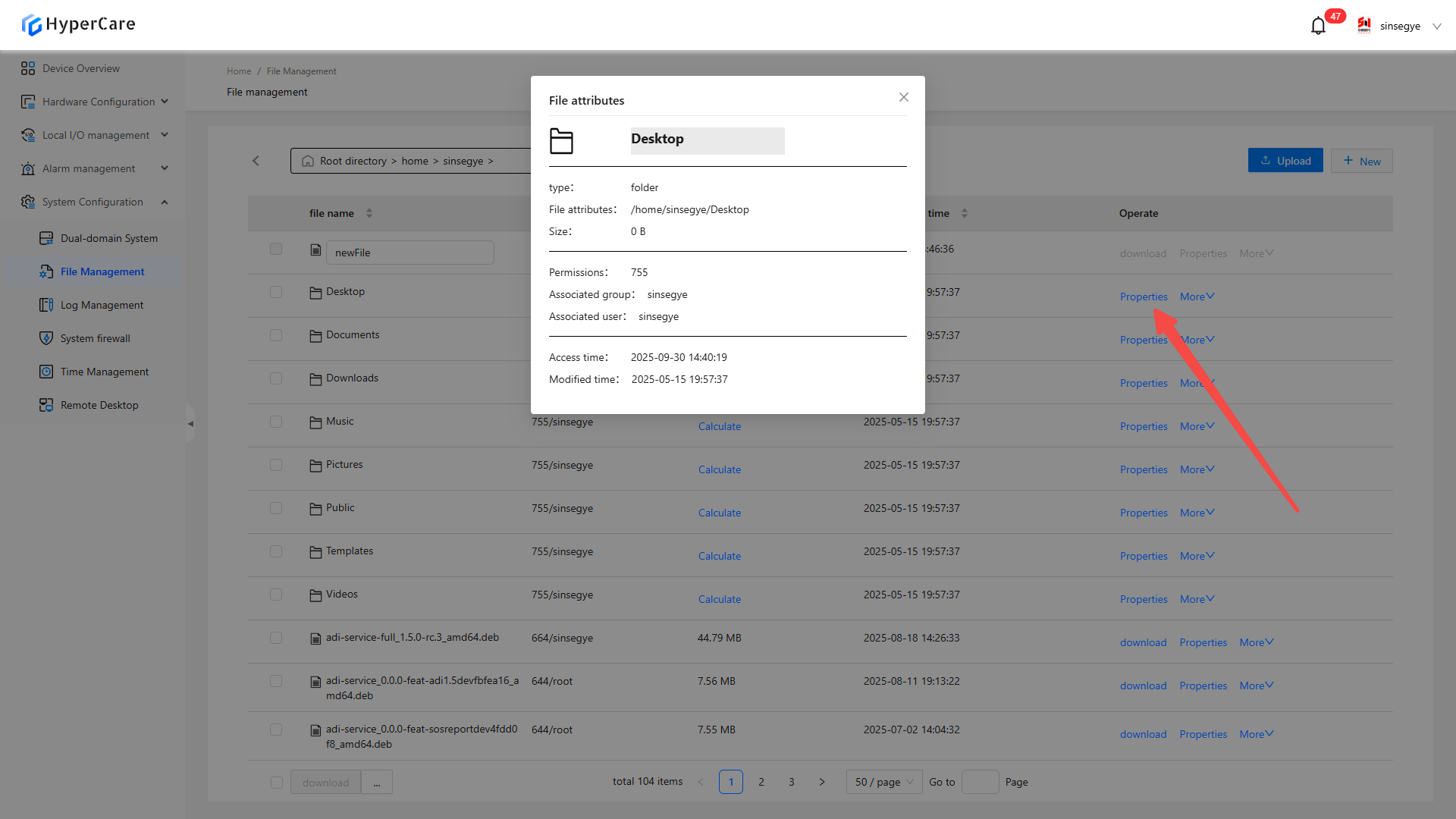 Property: Display details such as file type, full path (replicable), size, promission, time stamp