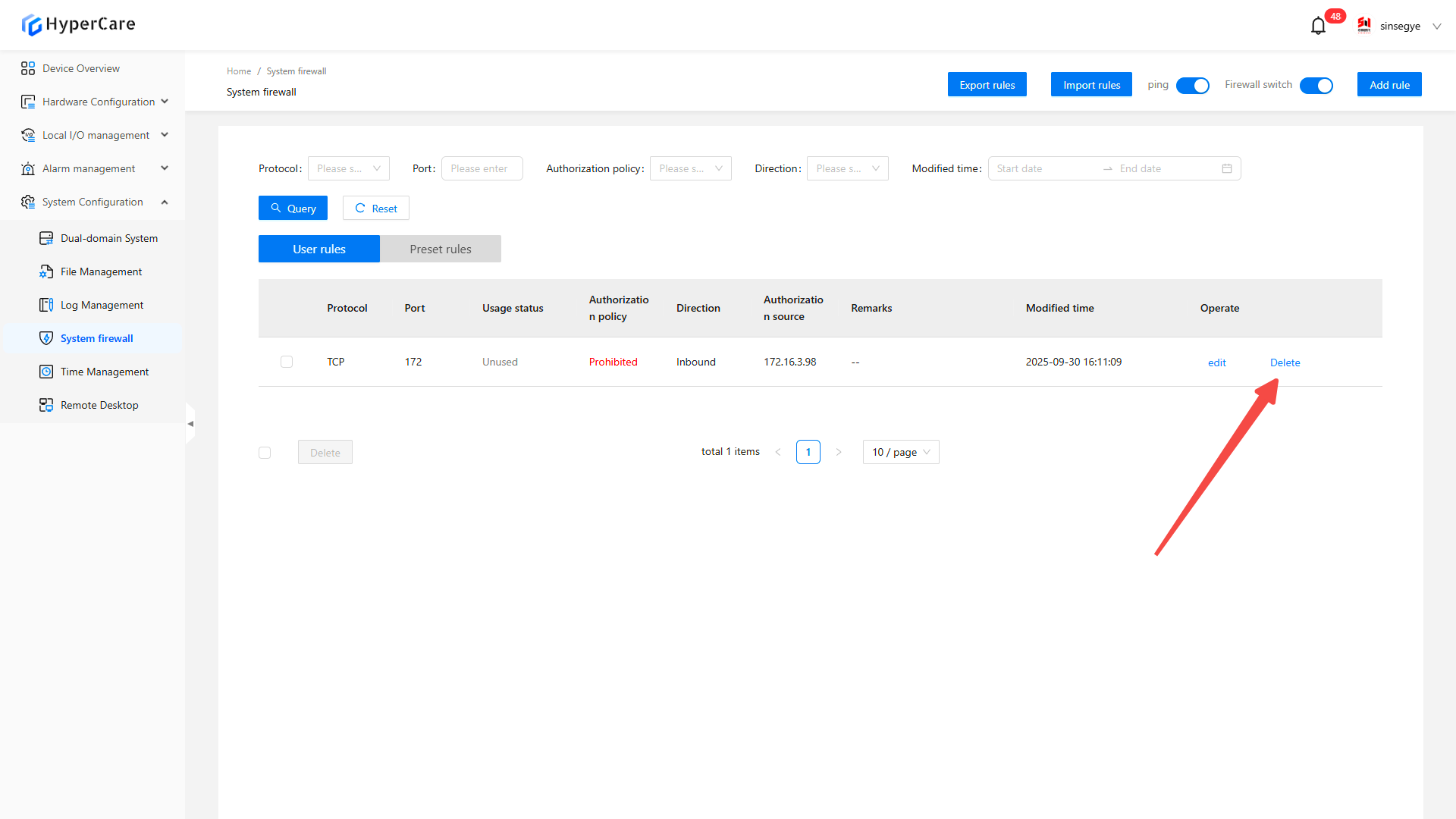 Click the \[🗑] icon next to the configured IP or routing entry.