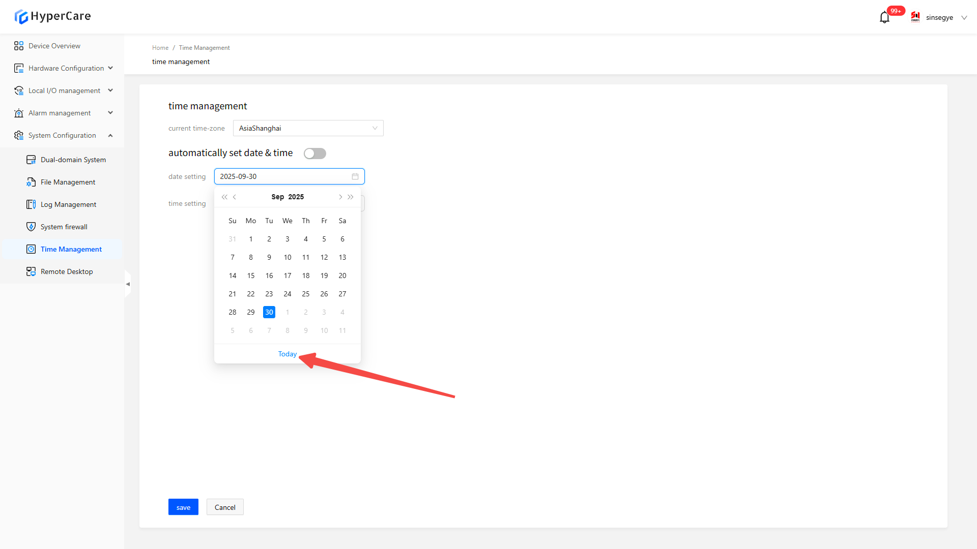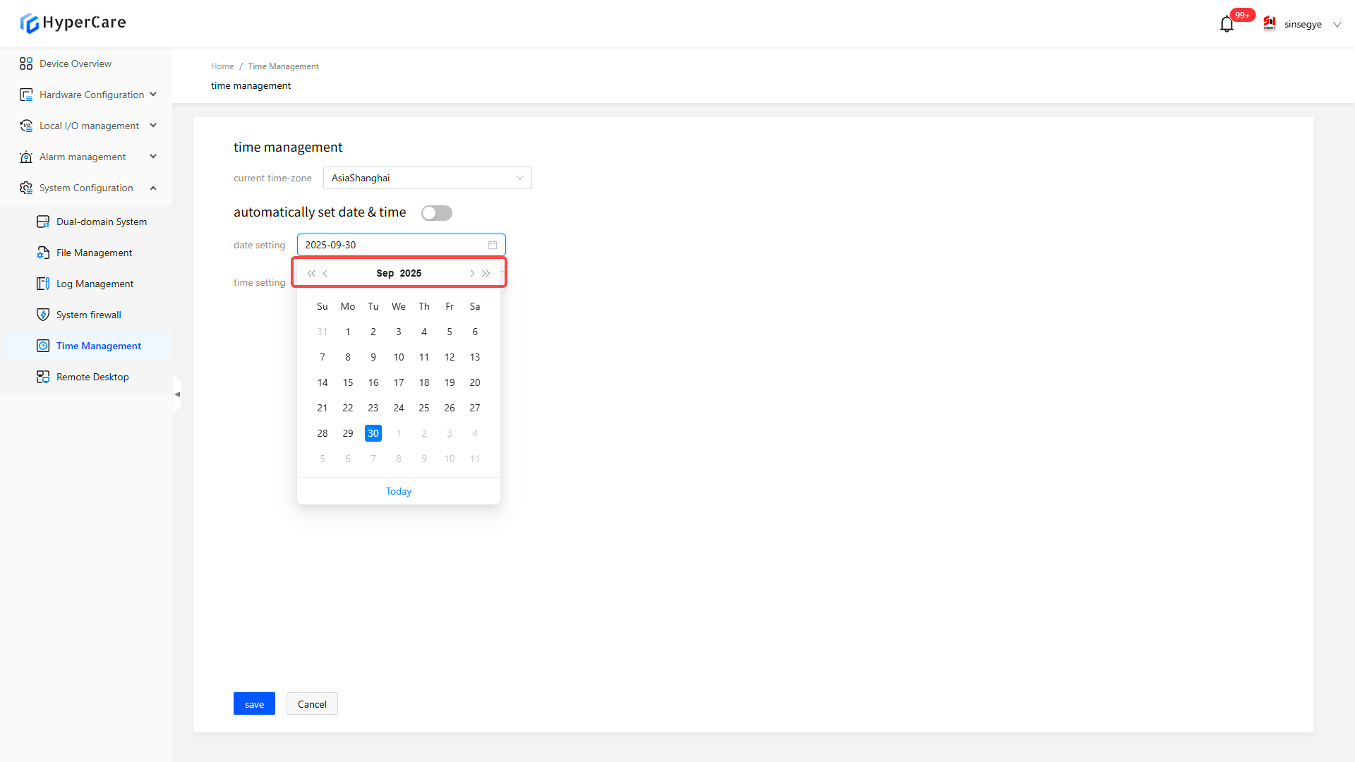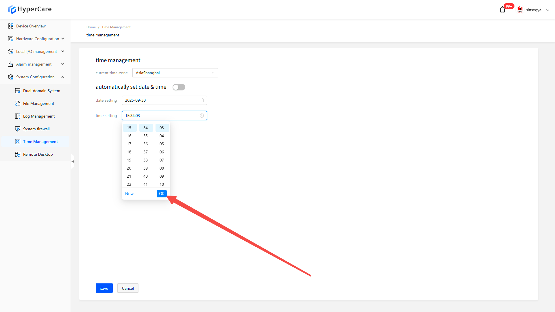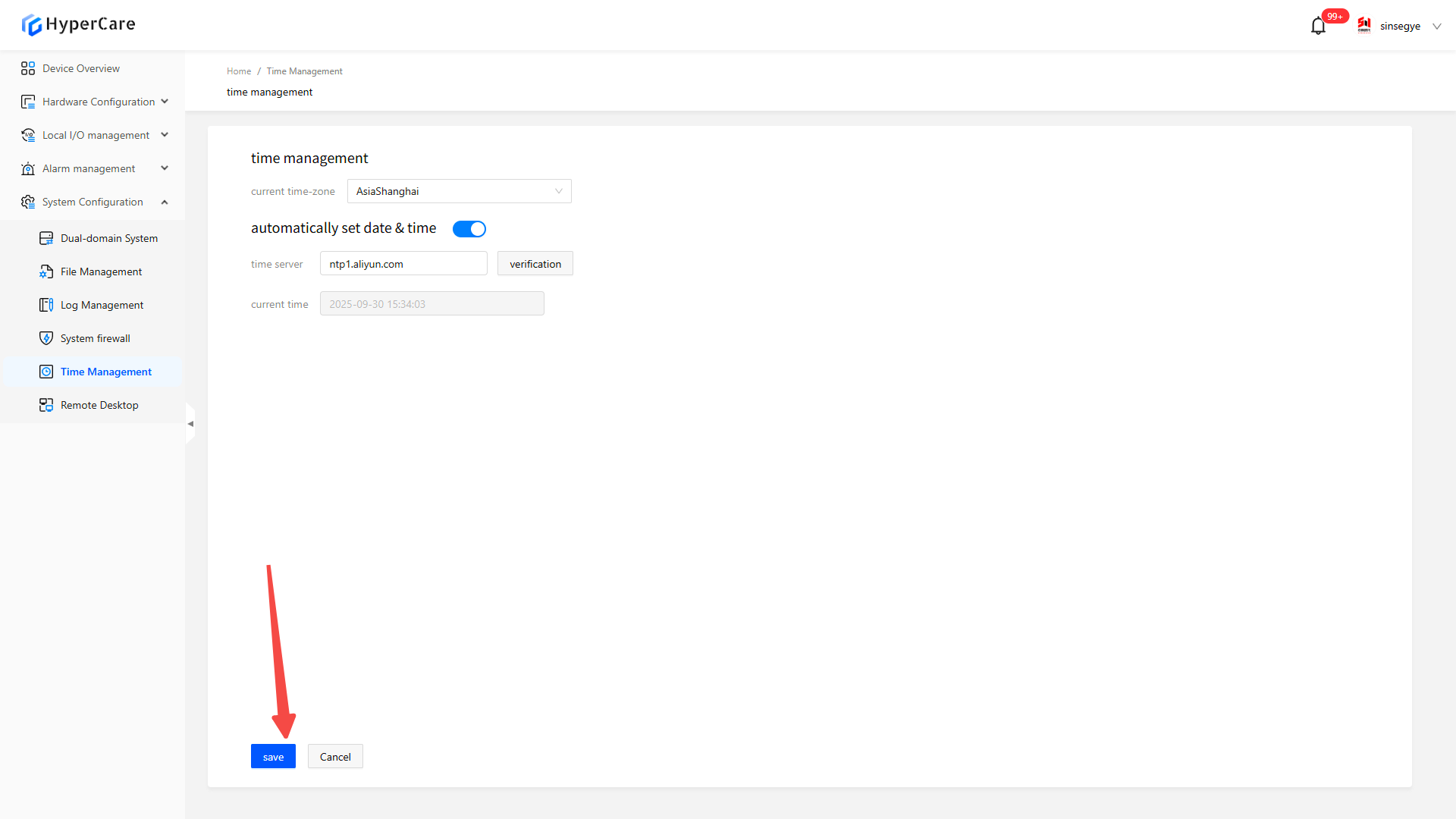 Even if only partial configurations are modified, the final effective settings are determined by the time zone, date, and time displayed on the page, and the modification must be confirmed by clicking \[Save].