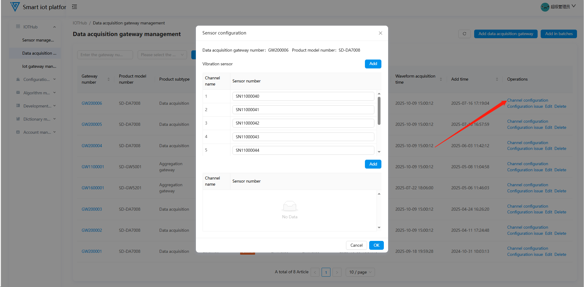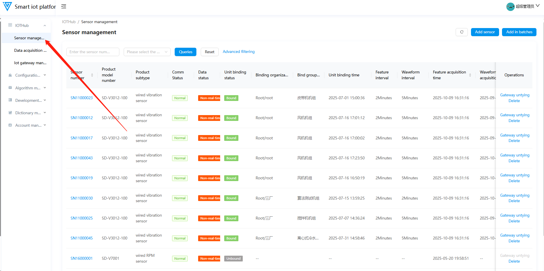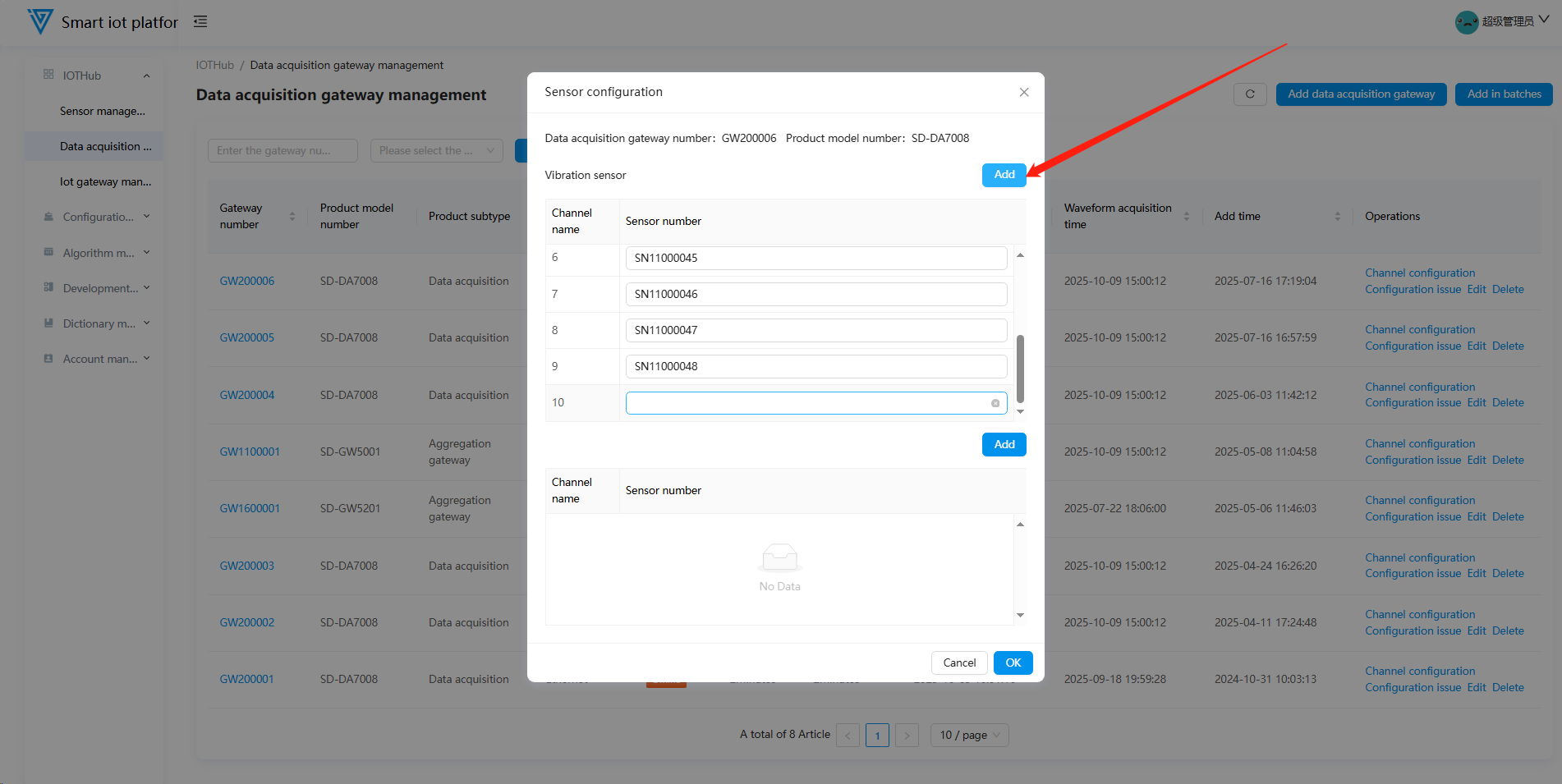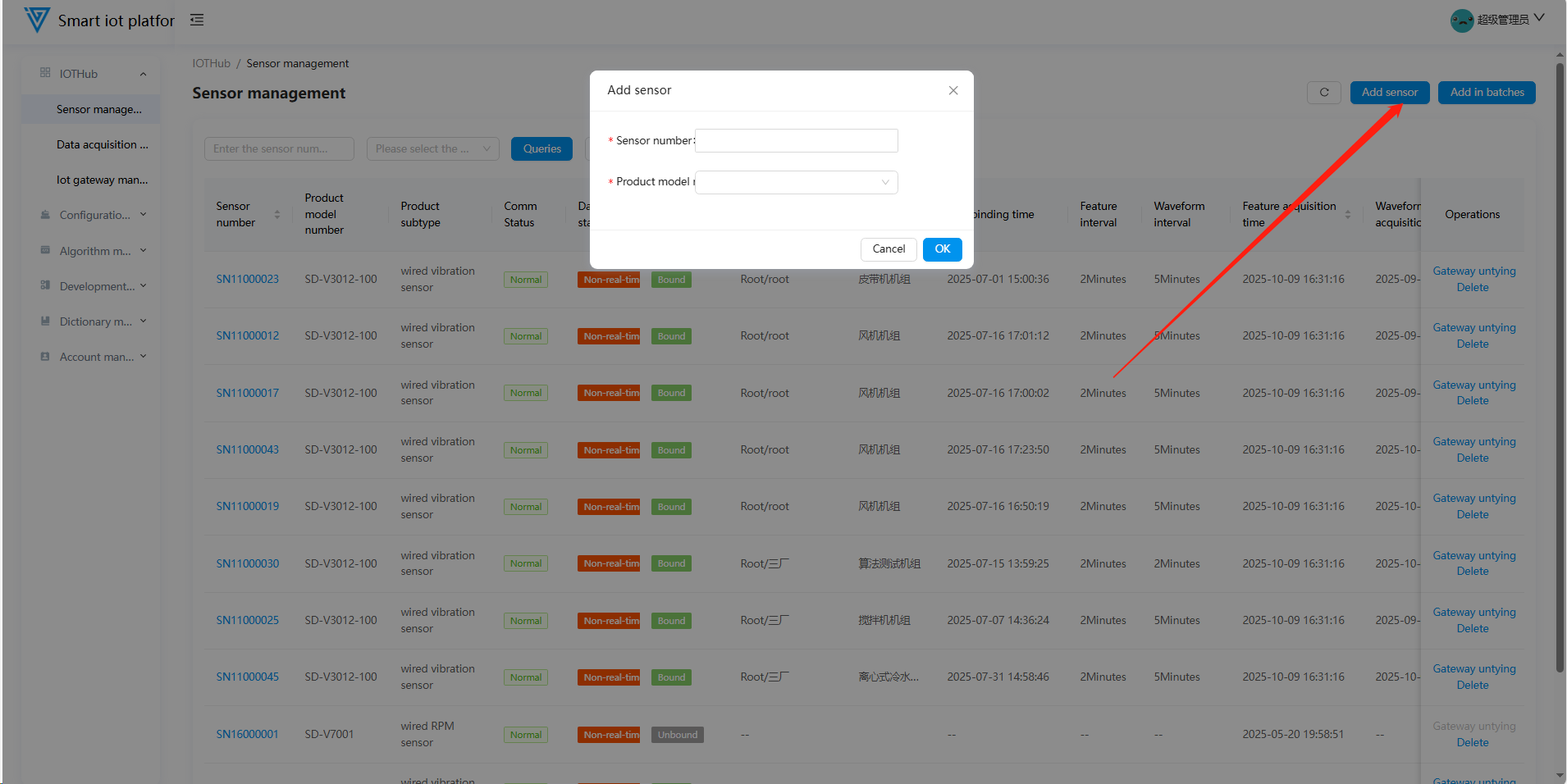 When adding sensors, note that the sensor serial number starts with "SN" and is 10 digits long. The middle two digits represent the monitoring type, and the last six digits are the unique serial number. The correspondence between sensor product models and serial numbers is as follows: