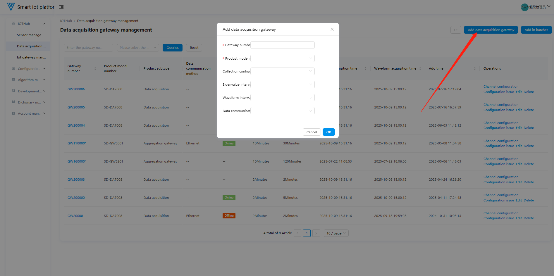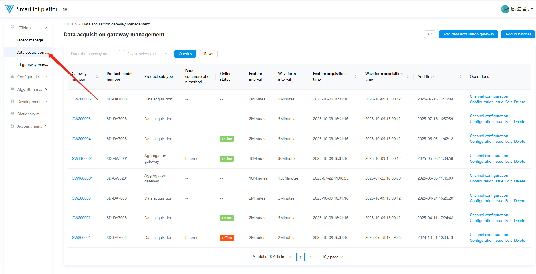 The product number of the data acquisition gateway starts with "GW" and is 8 digits long. The first two digits are fixed as "GW", the middle one digit indicates the gateway type, and the last five digits are the unique serial number. The correspondence between gateway products and serial numbers is as follows: